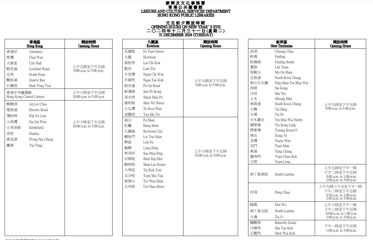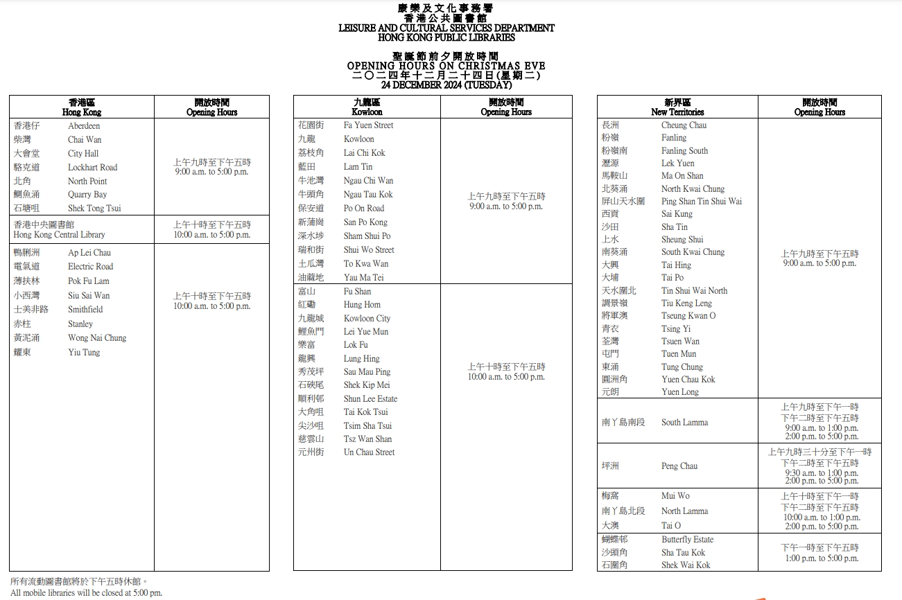 康文署宣布,所有香港公共圖書館、流動圖書館和學生自修室,在12月25日、26日(聖誕節及翌日)不會開放,而12月24日(聖誕節前夕)將提前至下午5時休館。至於元旦假期,公共圖書館、流動圖書館和學生自修室於元旦日(1月1日)不會開放,前一天同樣提前至下午5時休館。