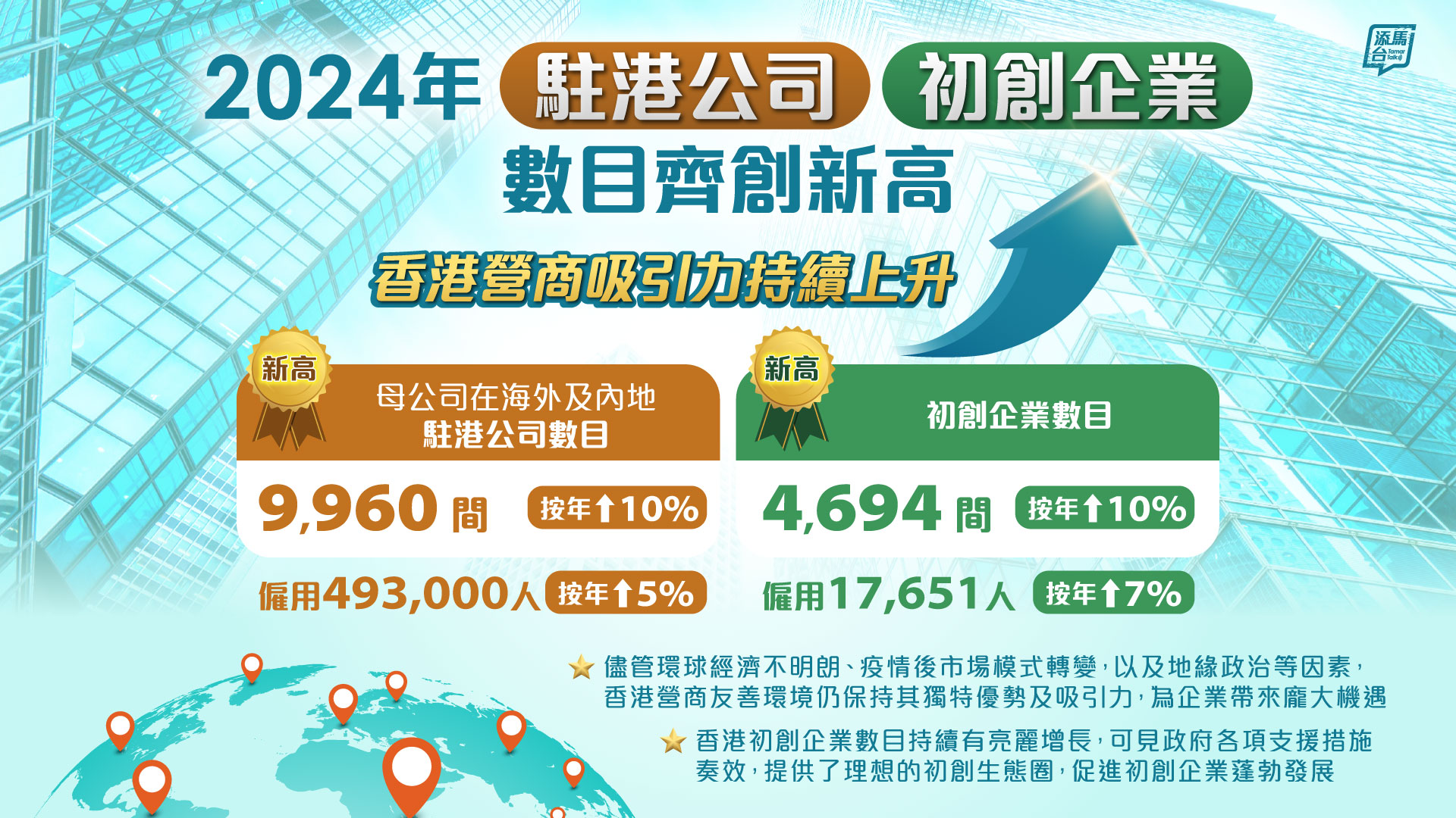 今日(12月17日)公布的「2024年有香港境外母公司的駐港公司按年統計調查」和「2024年初創企業統計調查」結果顯示 ,在2024年,母公司在海外及内地的駐港公司和香港初創企業數目均創新高,分別增加至9,960間及4,694 間,僱用人數分別達49.3萬人和逾1.7萬人,顯示香港營商吸引力有增無減,繼續是海內外企業設立或擴展業務的理想地點。
