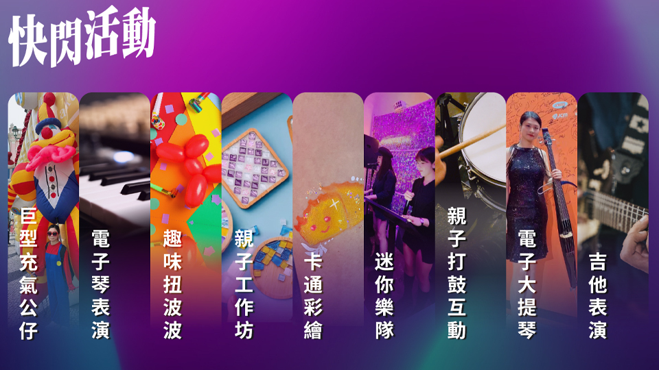 包括巨型充氣公仔出巡、親子工作坊、卡通彩繪、迷你樂隊、電子琴表演等。