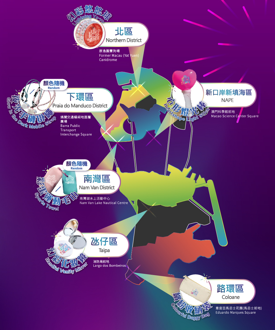 ● 公眾在活動現場拍照打卡,標註 #2024幻彩耀濠江、#lightupmacao2024 或 #ilumninarmacau2024,分享至公開社交平台並集齊10個讚好(現場完成線上問卷調查可抵扣5個讚好),即可於諮詢站換取專屬紀念品1份;同時更可參與集章遊戲及「麥麥接接樂」,有機會換取限量小禮物。