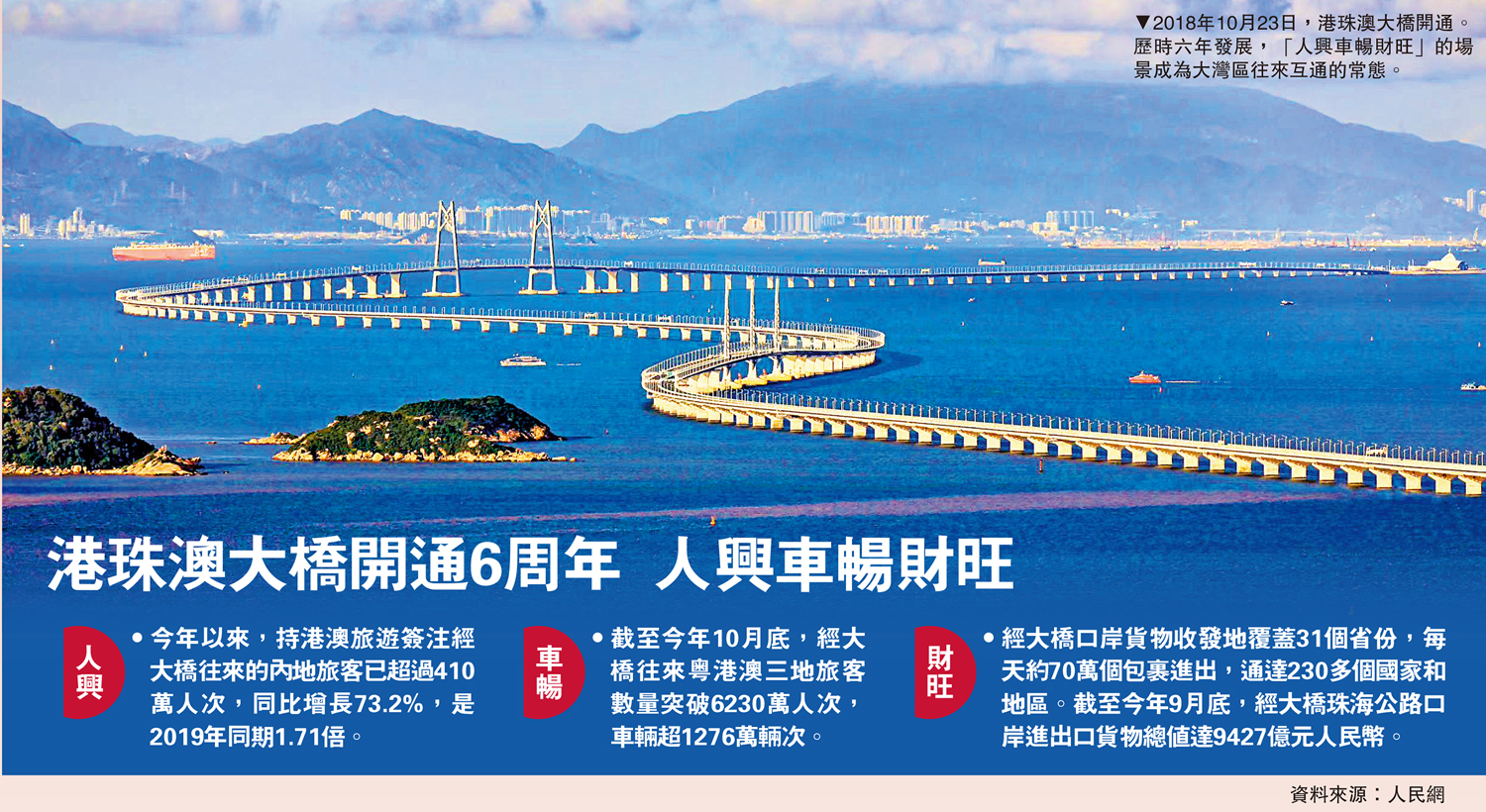 •10月23日,港珠澳大橋開通。六年來,「車暢人旺」的場景,早已成為大灣區往來互通的常態。