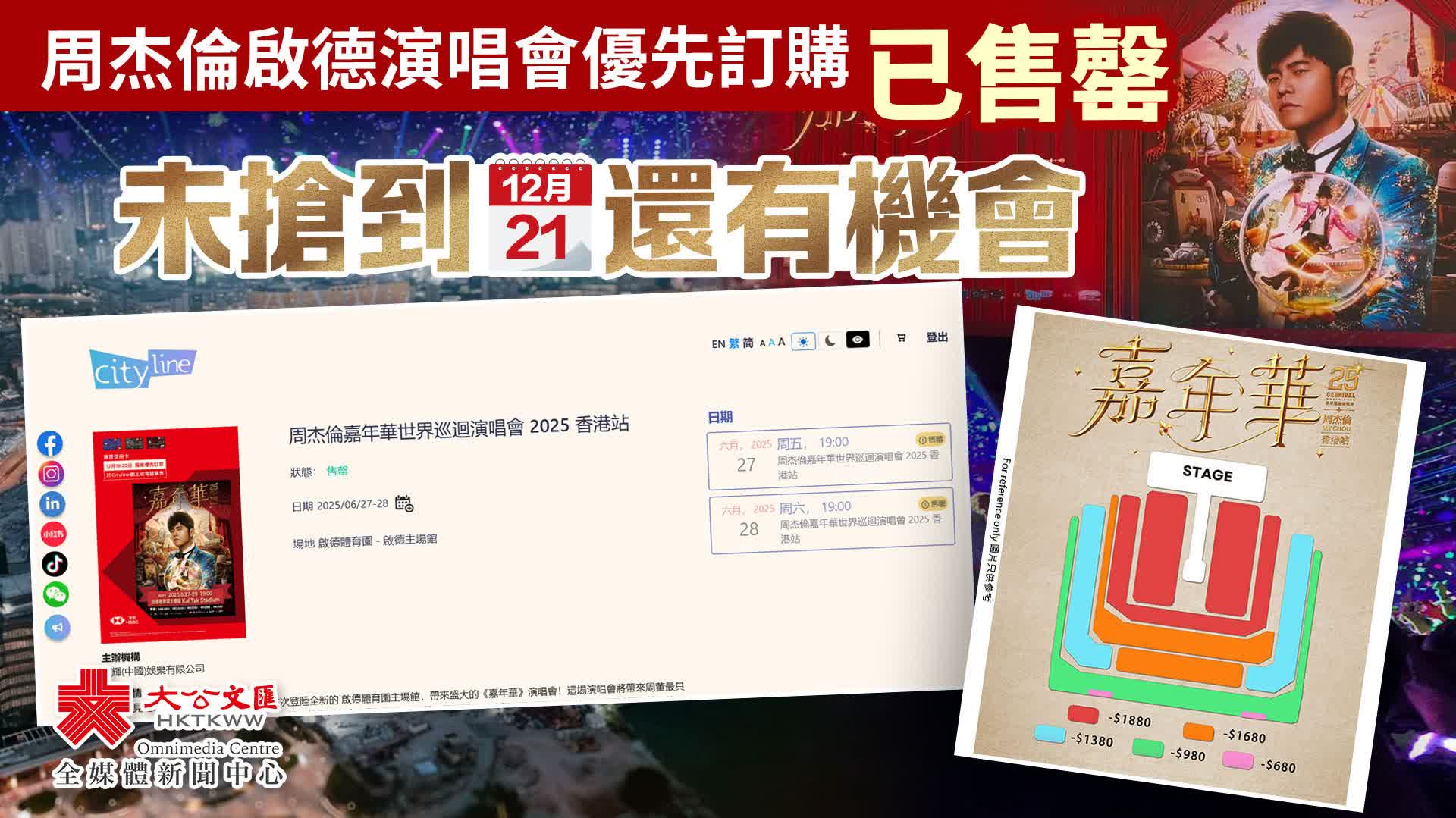 不過,未能搶到票的市民也不用太失望,因本周六(21日)上午10時還會迎來演唱會公開售票。而今日優先訂購並不包括2025年6⽉29日的場次,相信到時將有更多門票放出,粉絲們可把握最後機會搶飛,一睹周董風采。大家可提前在Cityline網站上註冊為會員,以便順利訂票。