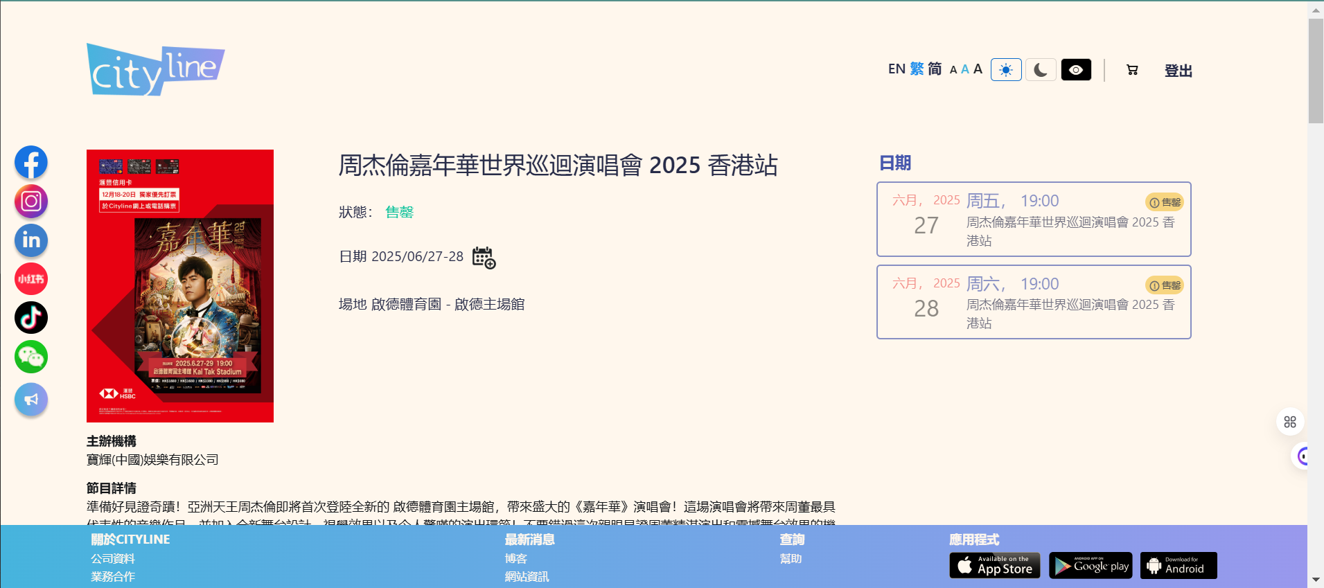 周杰倫香港站演唱會定於2025年6月27日至29日,在啟德體育園的主場館舉行,票價分別為1880元、1680元、1380元、980元和680元。