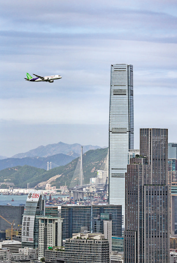 C919大型客機是中國首次按照國際通行適航標準自行研製,具有自主知識産權的噴氣式幹線客機。2023年12月,C919首次訪港,曾在香港國際機場展示,並於維多利亞港上空作飛行演示。2024年6月,中國東方航空公司C919執飛的首個跨境商業包機從上海飛抵香港。2024年10月31日,香港機場管理局(機管局)公布,已與中國商飛客服公司簽訂合作備忘錄,合作推動C919大型客機在香港國際機場的運作及向全球市場推廣,包括合作推動C919在香港國際機場營運國際航線。