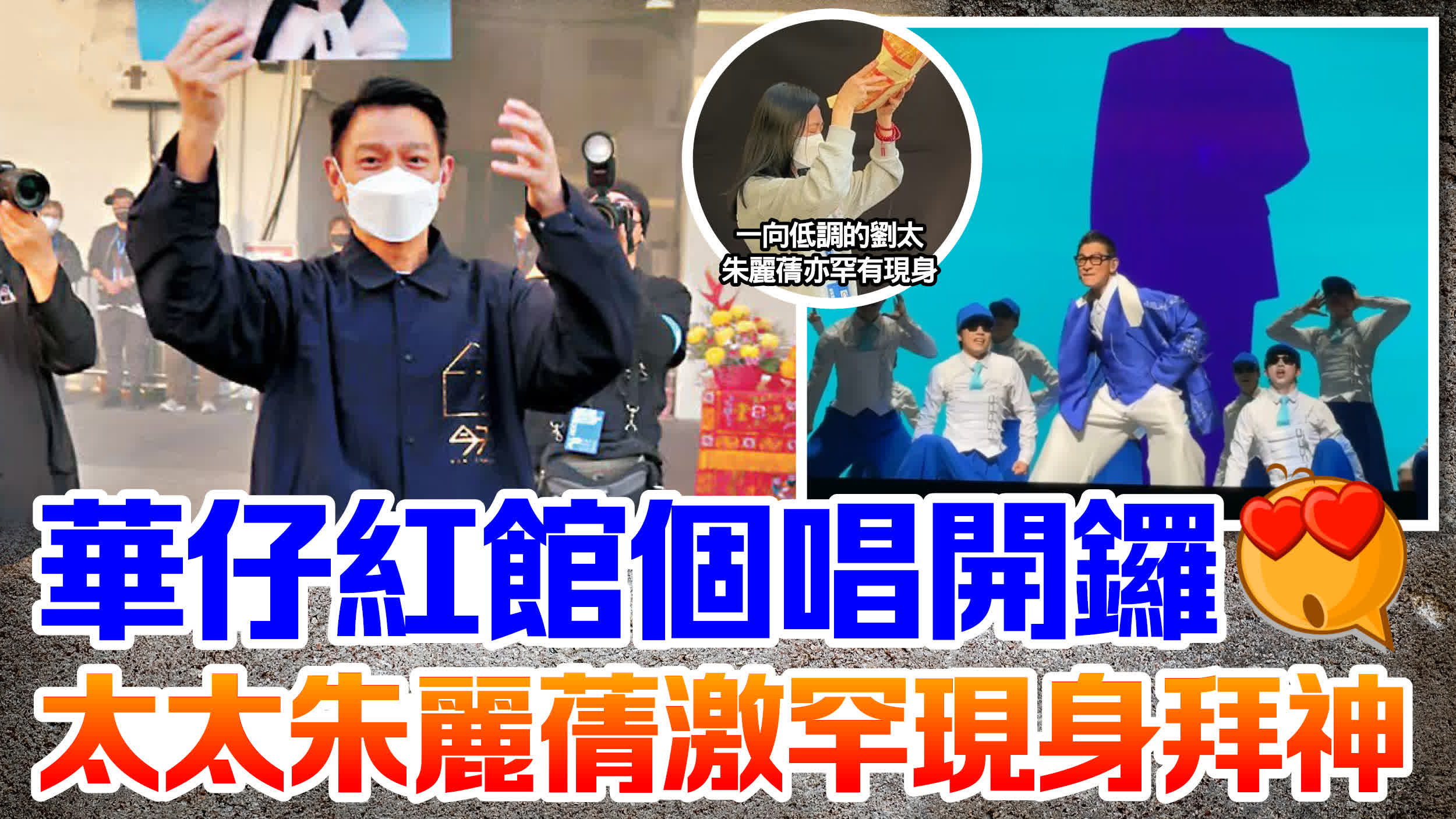 而華仔上香後,一向低調的劉太朱麗蒨亦罕有現身,素顏的她戴上口罩逗留神壇良久,誠心做足所有祈福儀式。當所有在場工作人員拜過神後,華仔率領大家舉起手一齊為頭場演出打氣。