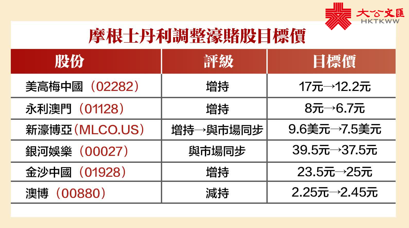 大摩預期,12月賭收料相對疲弱,但明年首季料有強勁反彈,該行同時調整濠賭股目標價,詳見下表。