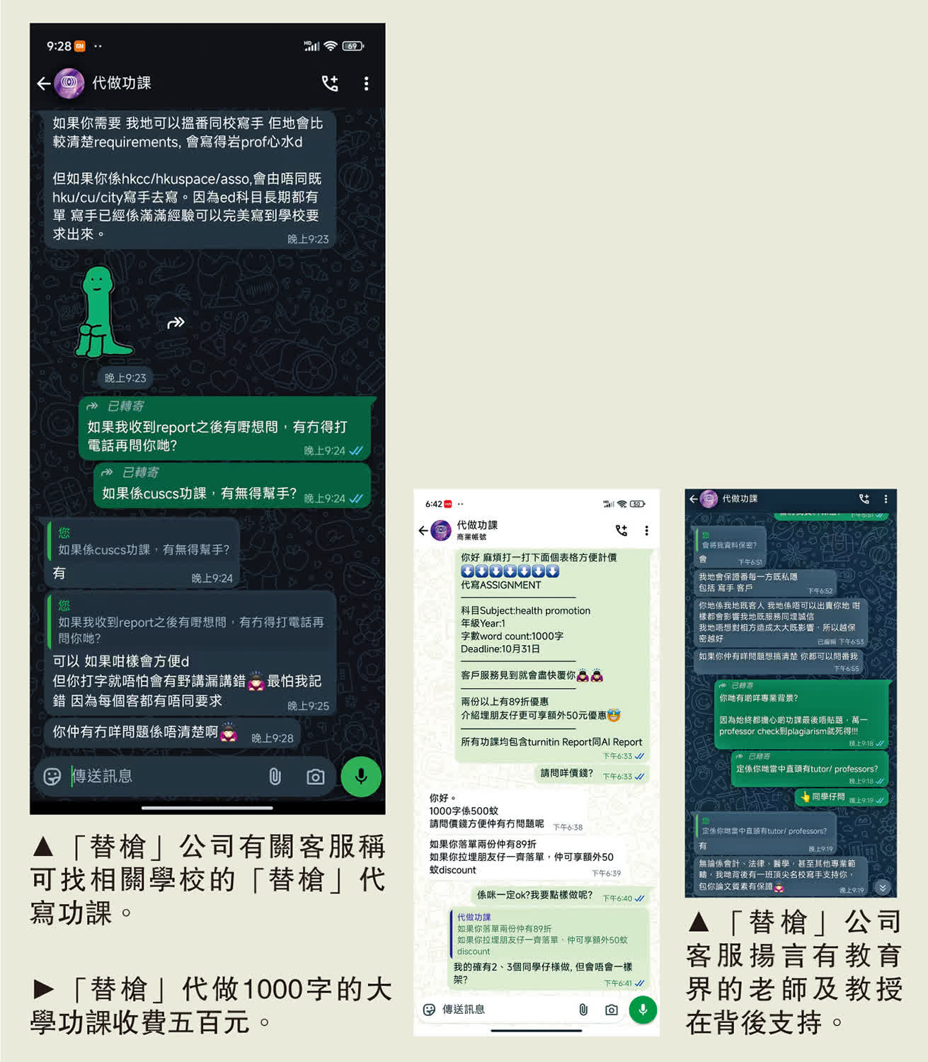 客服又表示寫手及客戶的資料均會保密,更揚言當中有教育界的老師及教授,無論什麼專業範疇均有頂尖寫手支持,「包你論文質素有保證。」、「如果你需要,我們可以找同校寫手,他們會比較清楚requirements(要求),會寫得合乎教授的要求,但如果你是HKCC(理大香港專上學院)/HKUSPACE(港大專業進修學院)/ASSO(副學士),會由不同的HKU(港大)/CU(中大)/CITY(城大)寫手去寫。因為科目長期都有訂單,寫手已經是滿滿經驗可以完美寫出學校要求。」對方及後更「拍心口」表示,相關論文均會經用於剽竊檢測的在線服務Turnitin及AI檢查,再給上級「老細」審核才會交貨,「成績有七成以上係A」,並展示不少「奪A例子及作品」。