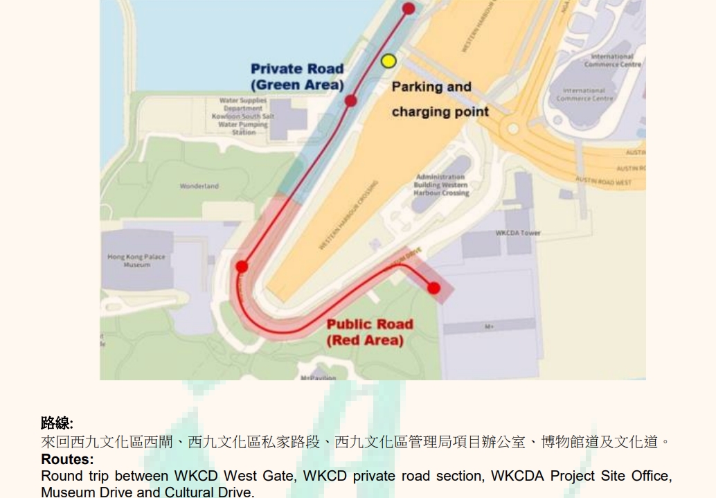 冠忠遊覽車有限公司獲批准兩輛自動駕駛車輛在西九文化區內於指定時段和路段進行測試,來回西九文化區西閘、西九文化區私家路段、西九文化區管理局項目辦公室、博物館道及文化道。測試期間,車上會長駐有後備操作員以在有需要時接管車輛的操控。該先導牌照的詳情已上載運輸署自動駕駛車輛測試網頁。