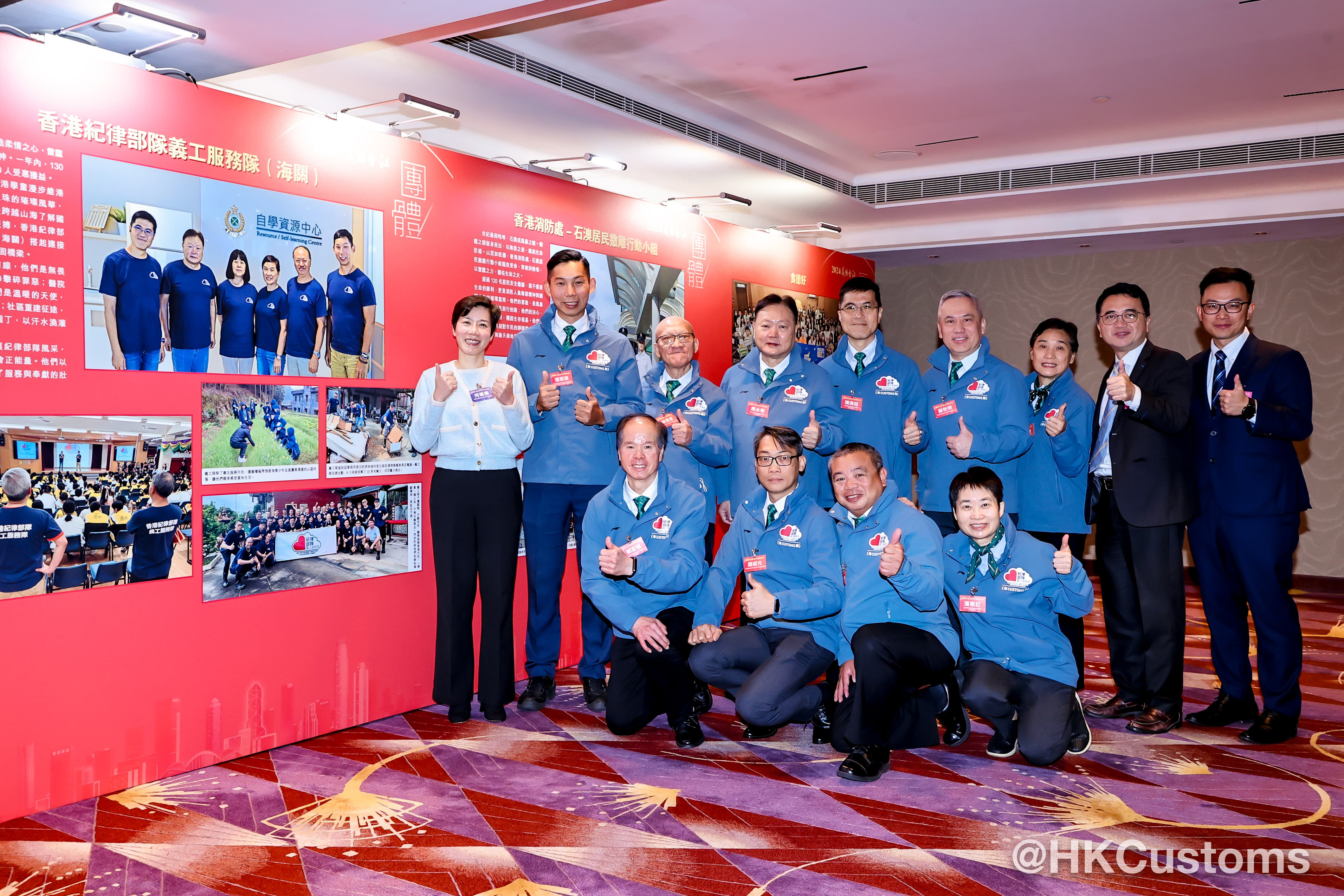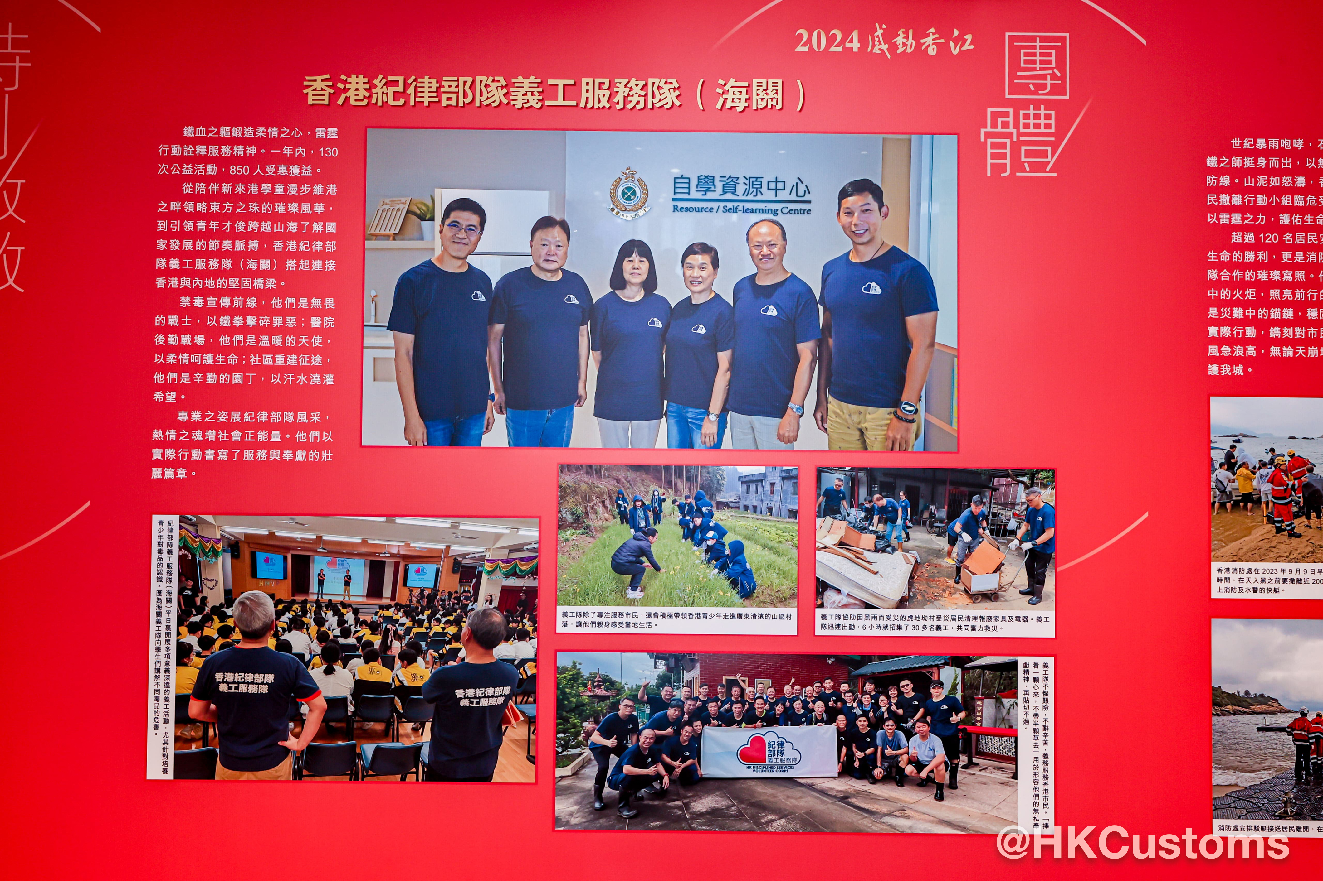 在過去一年中,香港紀律部隊義工服務隊(海關)舉辦及參與超過130次公益活動,服務超過850人次。例如,帶領青年了解國家歷史、基礎建設及科技的發展,推動禁毒宣傳活動,並協助去年9月因黑雨水浸而受影響的居民清理及重建家園等。