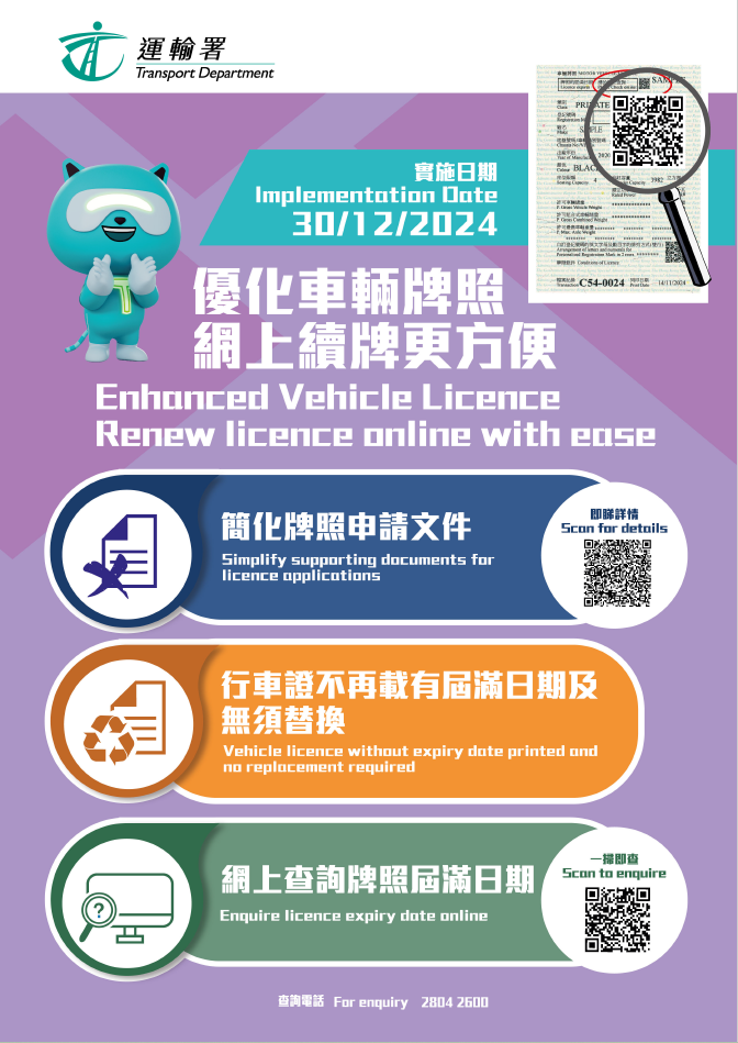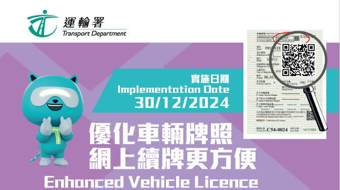 同時,署方會簡化車輛牌照申請文件,讓車主可更快更便捷地完成續領「行車證」。屆時,車主續牌無需再提交「牌簿」(車輛登記文件),驗車合格後亦無需提交「驗車紙」(車輛宜於道路上使用證明書)。若經網上申請續領車輛牌照,在香港保險業聯會的後端支援下,如運輸署成功經聯會的網上系統即時核實車輛保險紀錄作為有效的證明,車主便無需上載保險單。