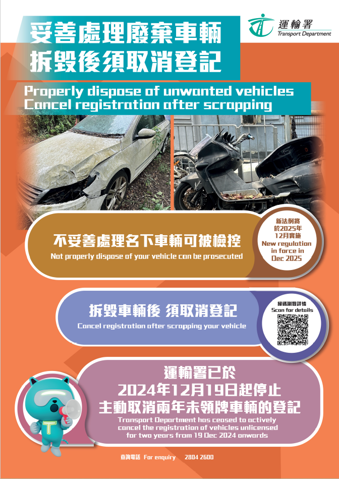 此外,《2024年道路交通(車輛登記及領牌)(修訂)(第2號)規例》已獲立法會通過,要求車主在接獲運輸署通知後3個月內為其2年未領牌的車輛續牌,或把車輛拆毀或永久送離香港後向運輸署取消車輛登記,否則會構成罪行;而未領牌車輛會保留在有關車主名下。