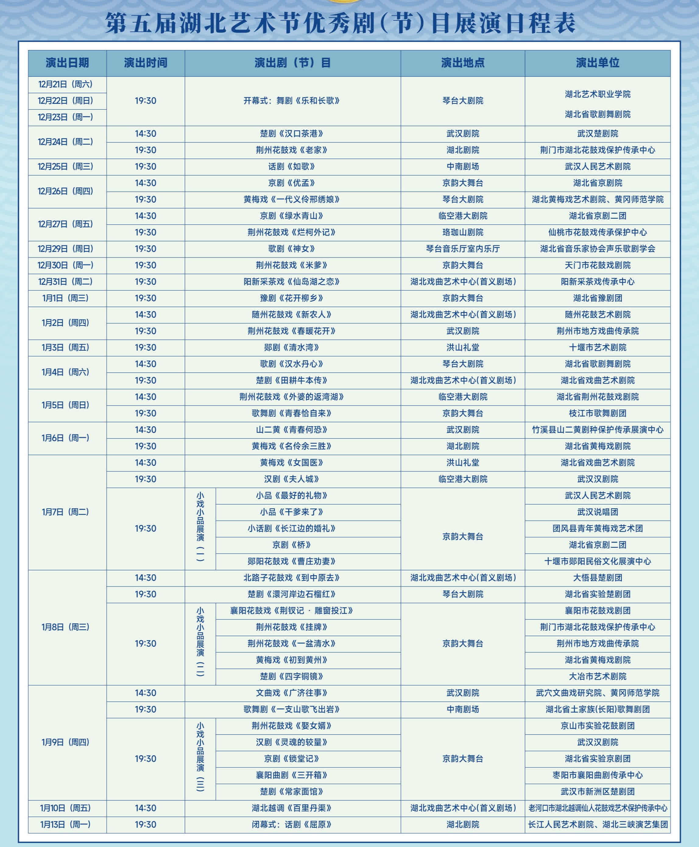 第五屆湖北藝術節開幕式將於12月22日晚在琴台大劇院舉辦,開幕式演出為國內一流創作團隊打造並入選文旅部2023-2025舞台藝術創作行動計劃的重磅舞劇《樂和長歌》;閉幕式將於2025年1月13日晚在湖北劇院舉辦,主要內容包括楚天文華獎頒獎儀式,閉幕式演出為新獲第十七屆中宣部精神文明建設「五個一工程」獎的話劇《屈原》。