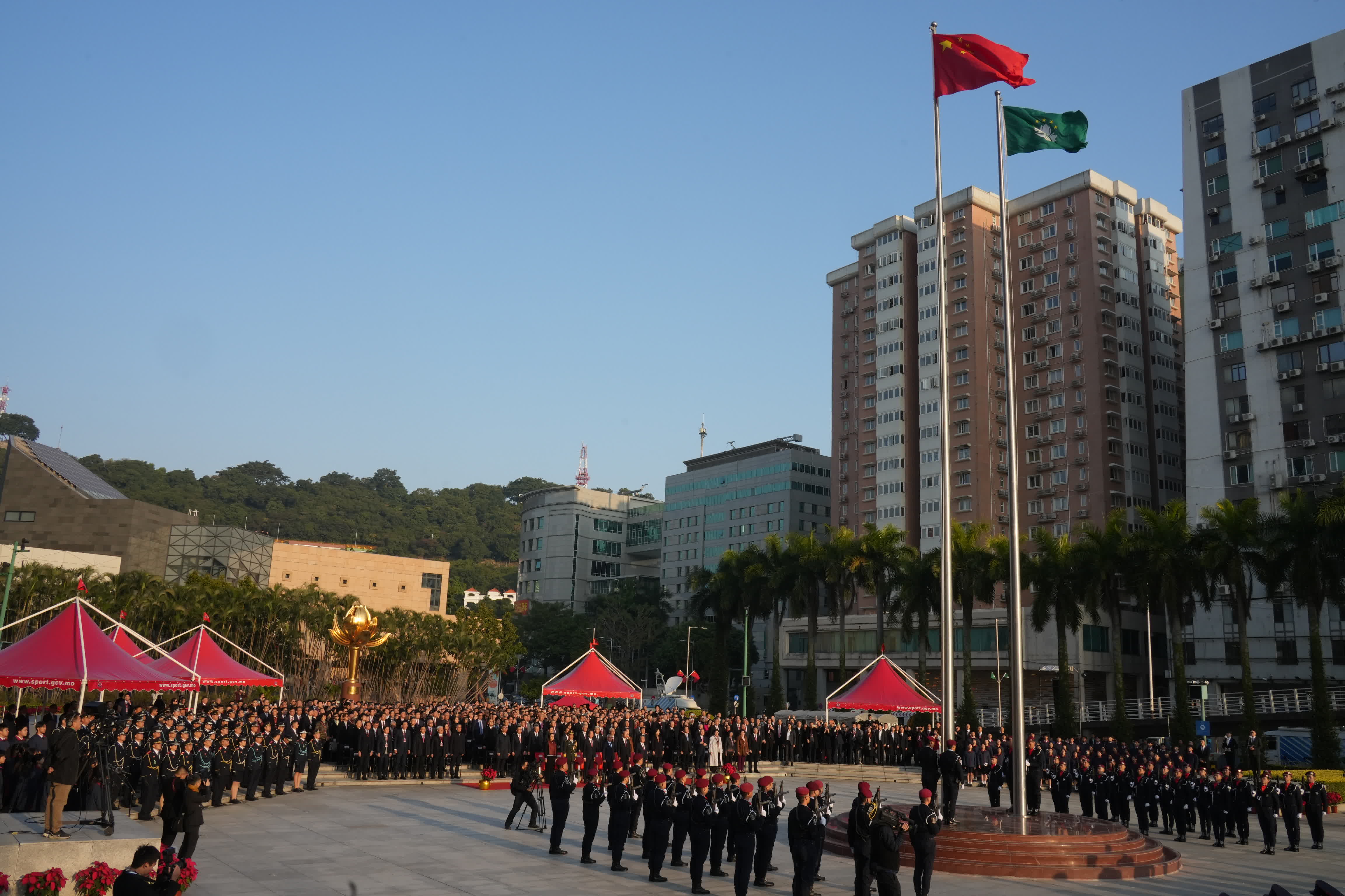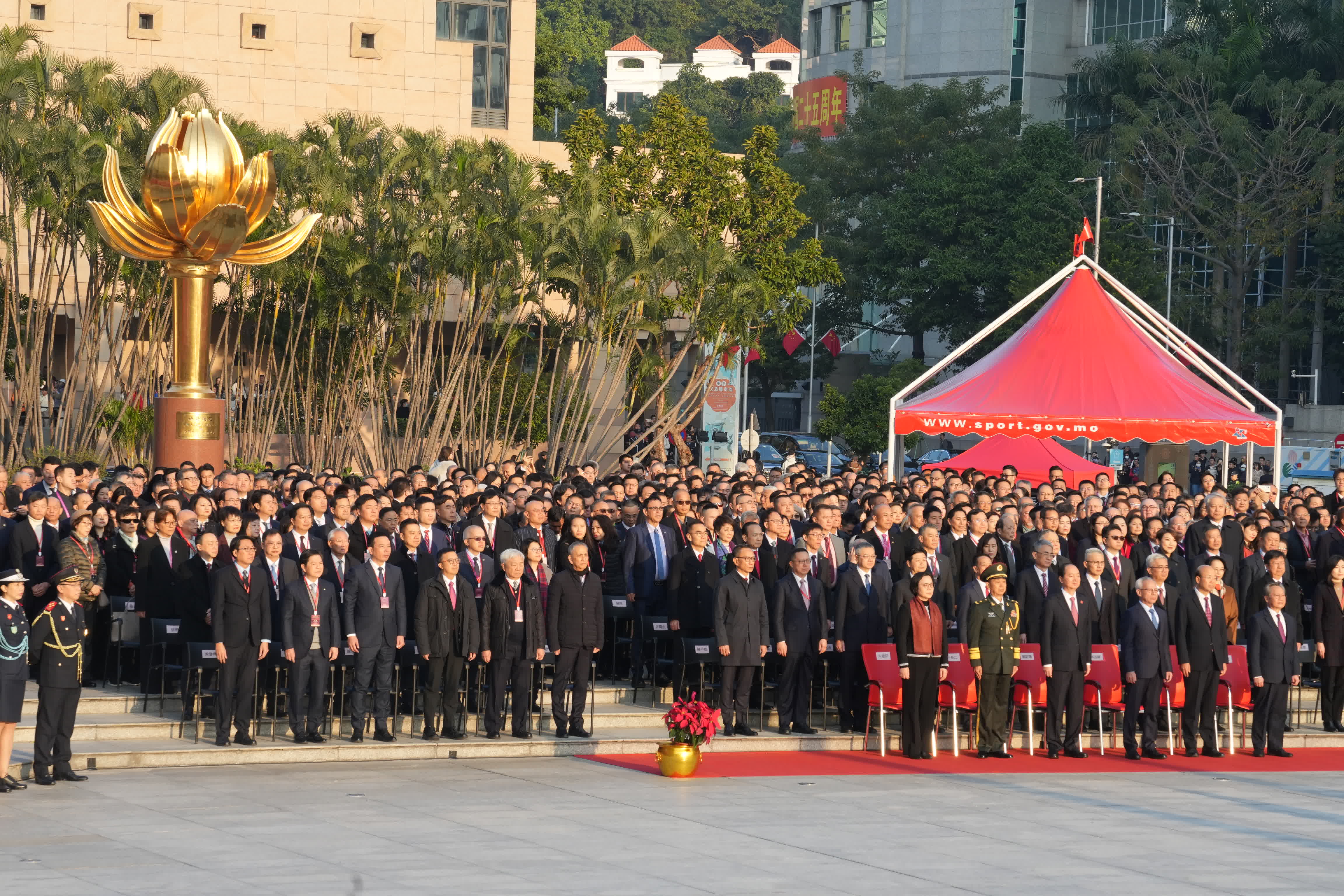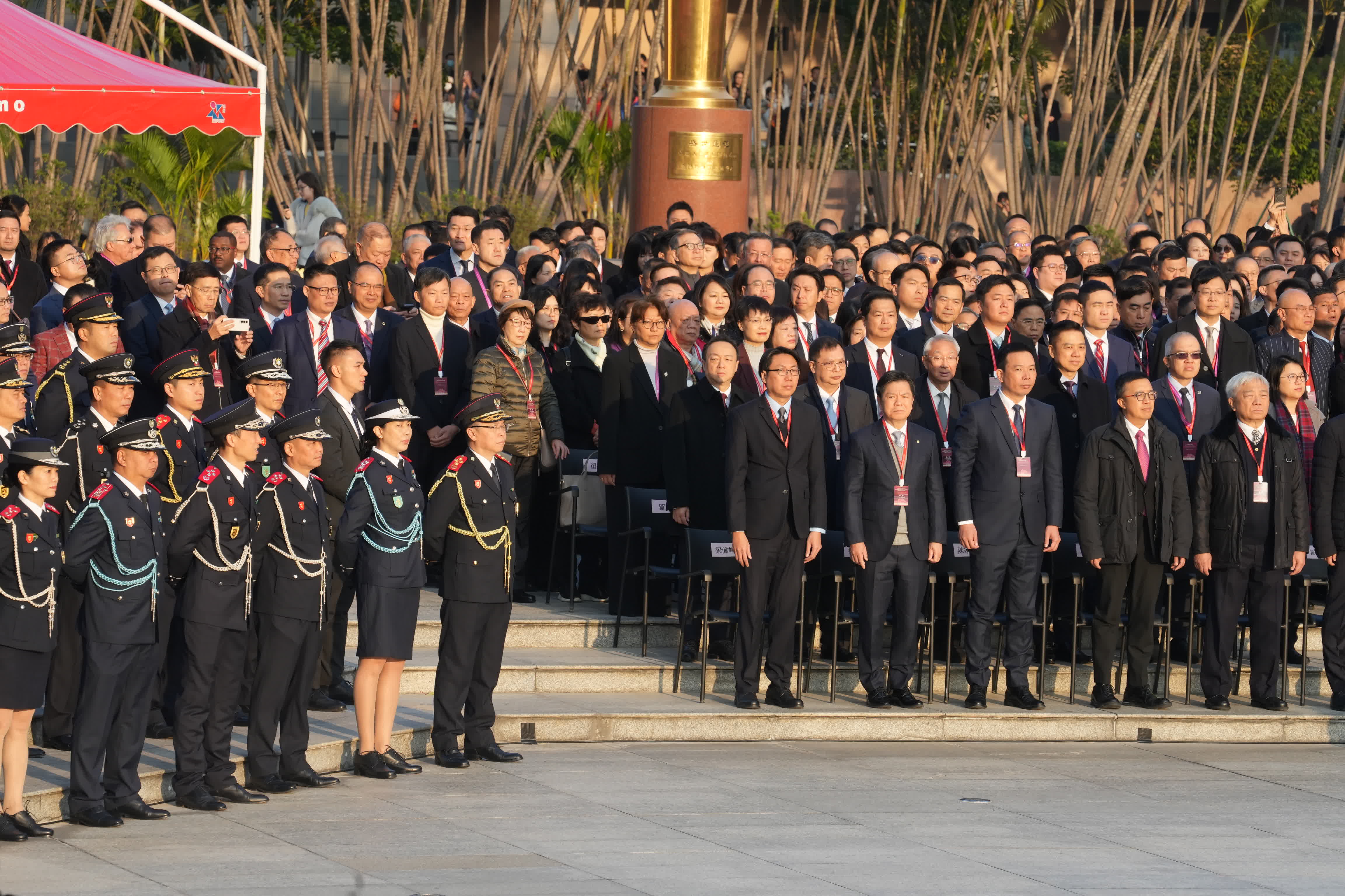 澳門第六任行政長官岑浩輝、澳門現任行政、立法、司法機構負責人出席升旗禮。中央政府駐澳門聯絡辦公室主任鄭新聰,外交部駐澳門特派員公署特派員劉顯法,中國人民解放軍駐澳門部隊司令員于長江等中央駐澳機構負責人亦有到場,見證歷史時刻。隨後,由海關、消防局等部門組成的儀仗隊向各嘉賓致敬。