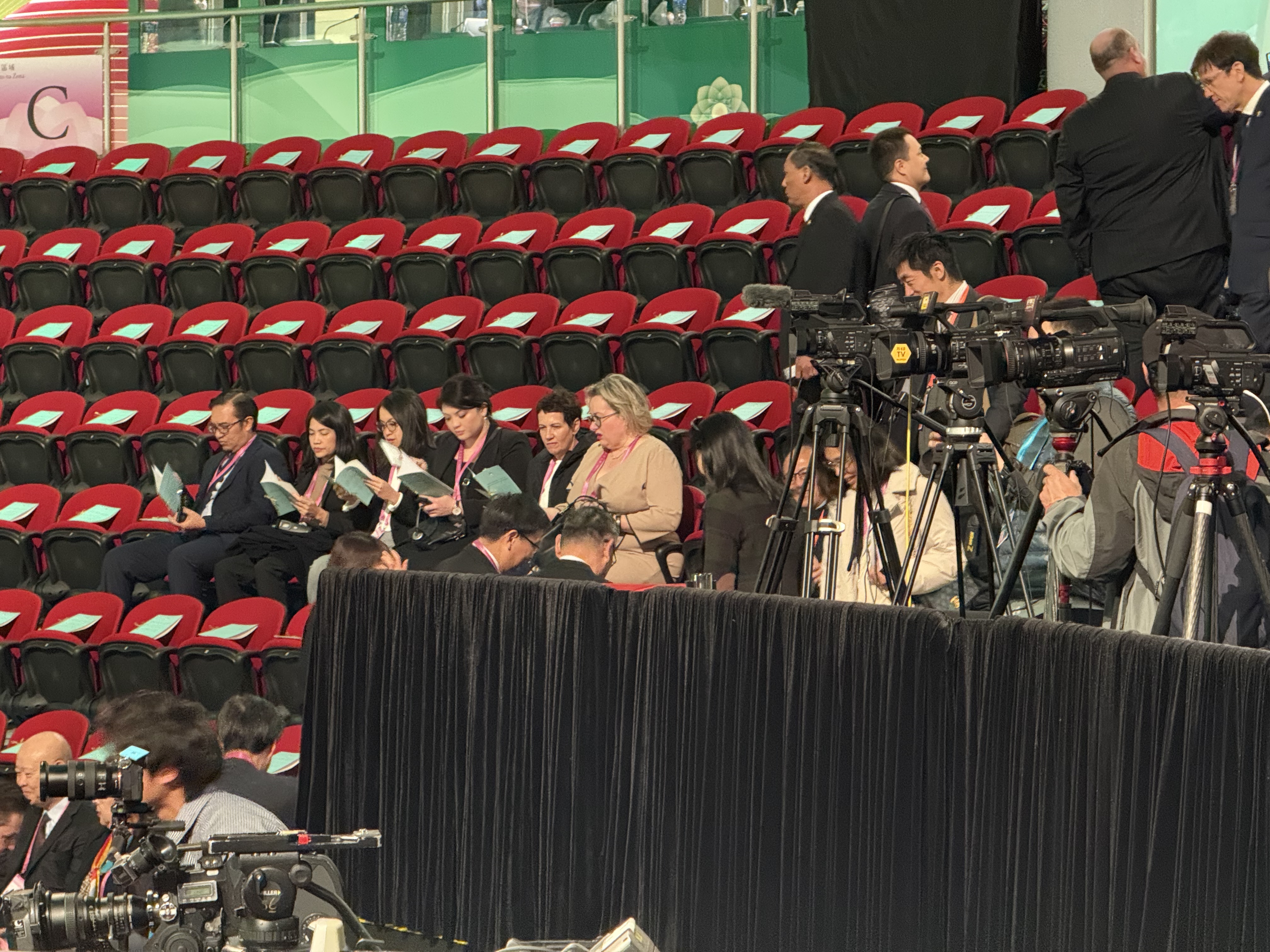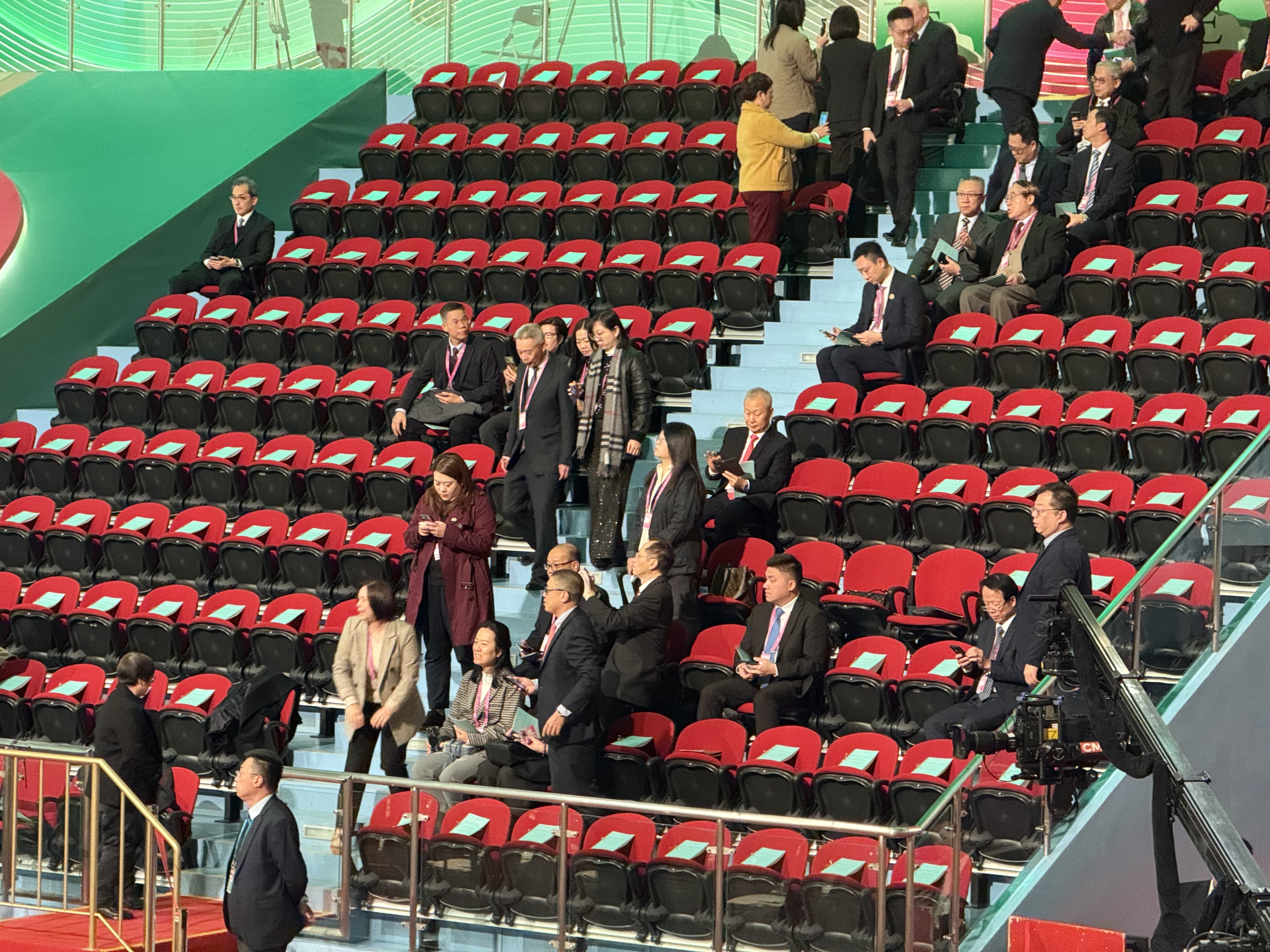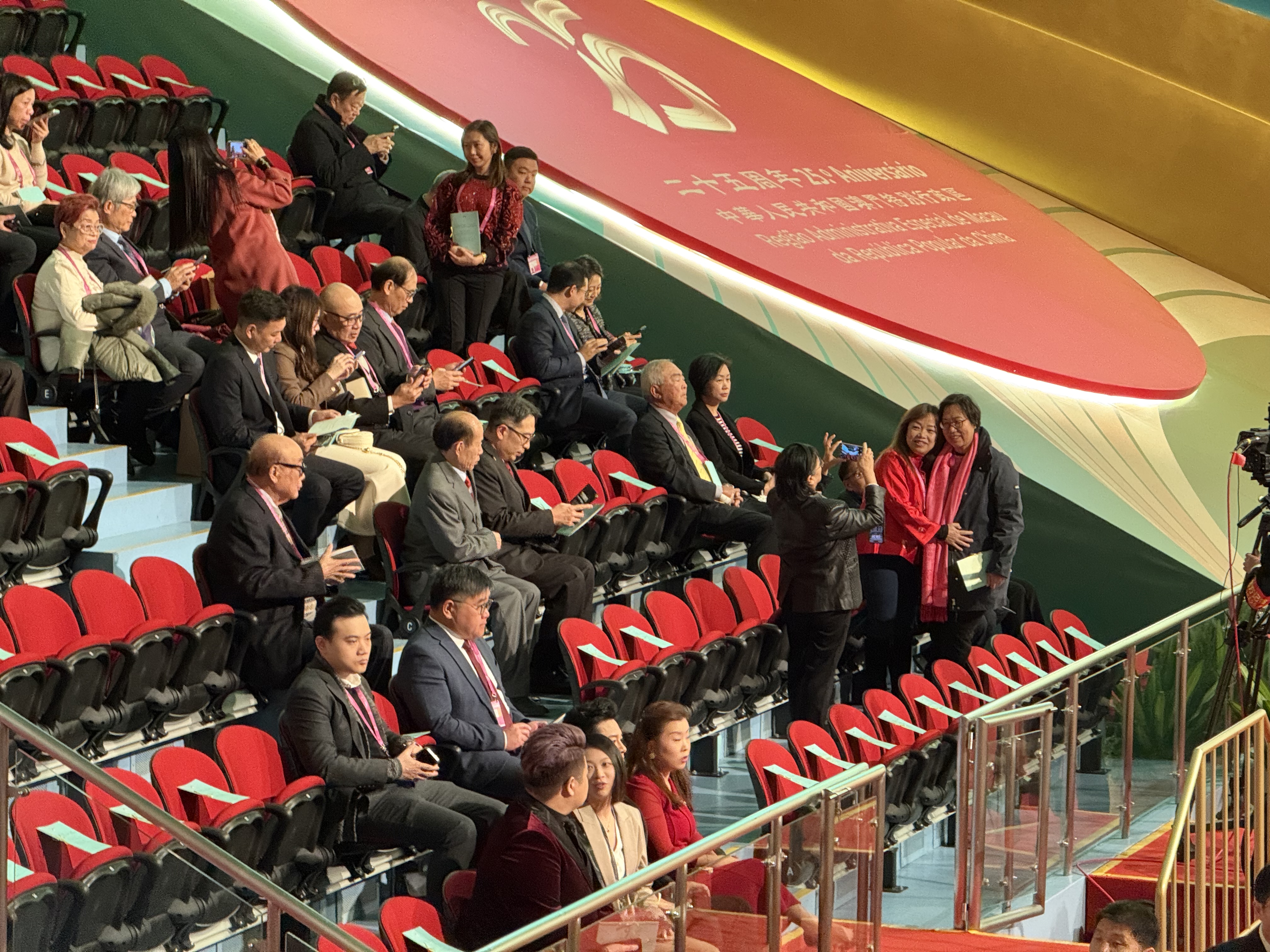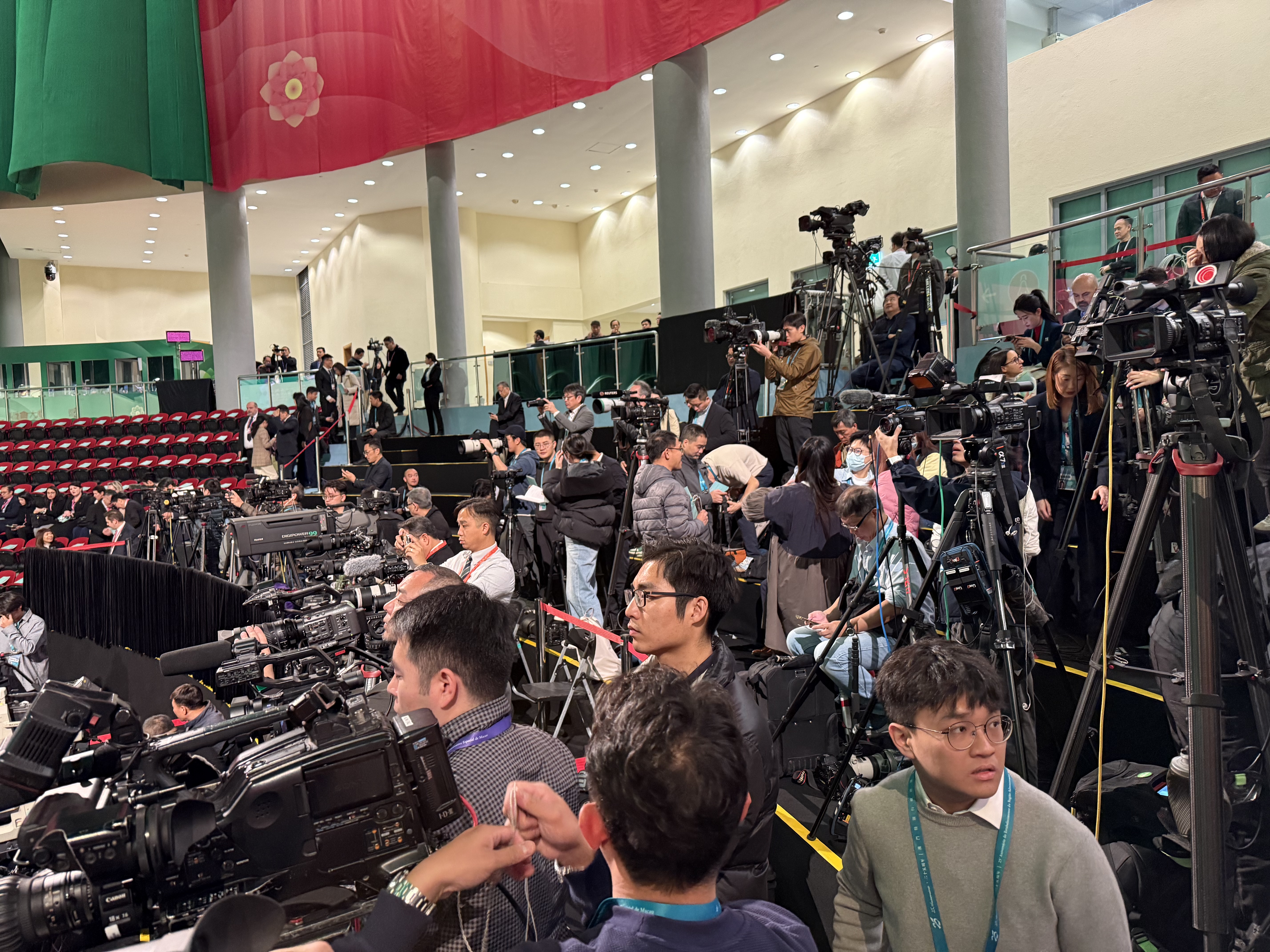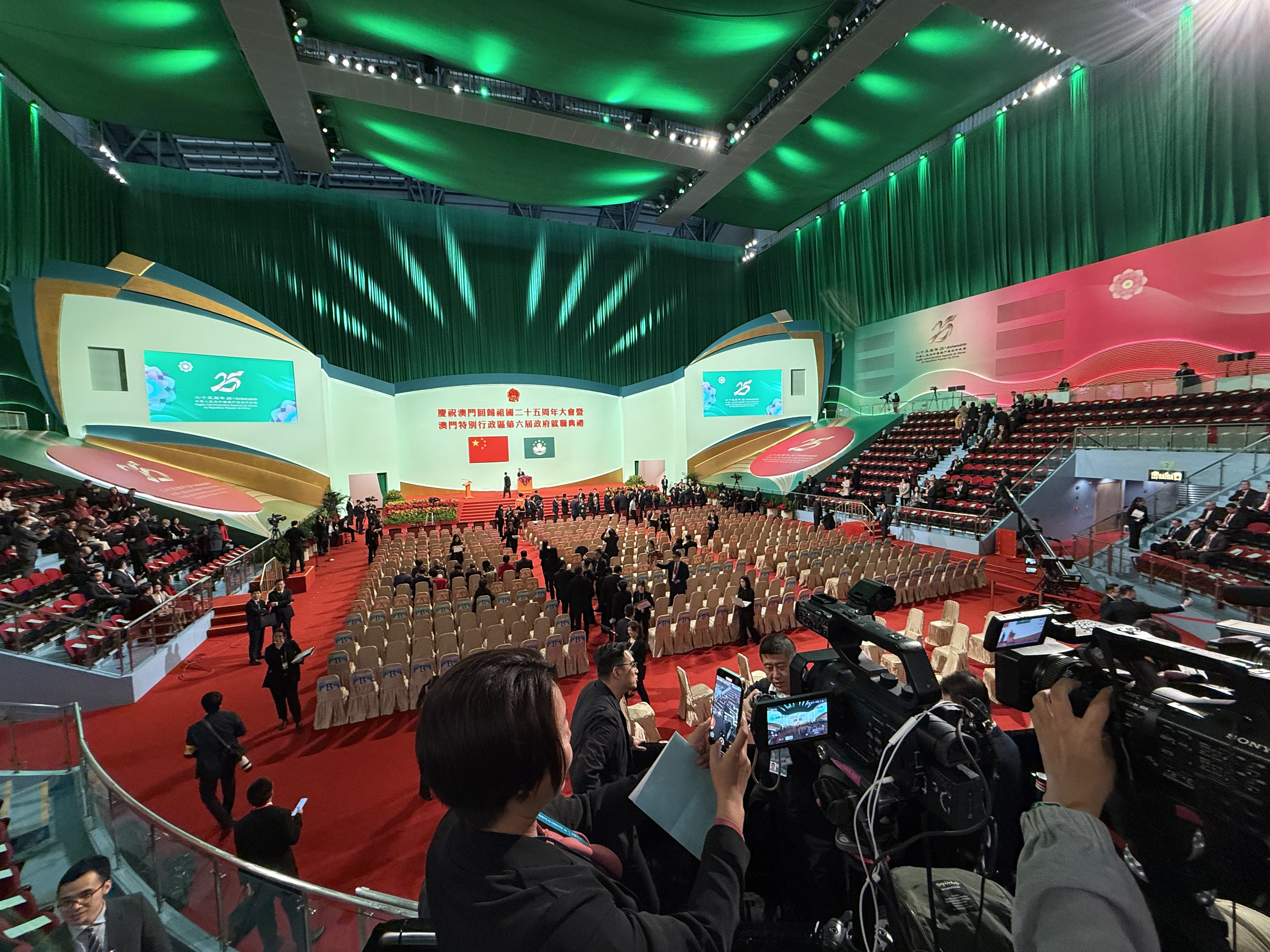 (大公文匯全媒體 記者 權世平 澳門報道)今日(12月20日)是澳門回歸祖國25周年慶典日。上午,澳門特別行政區政府舉行慶祝澳門回歸祖國25周年大會暨澳門特別行政區第六屆政府就職典禮。大公文匯全媒體記者清晨6時許就到新聞中心集合準備出發,8時許抵達澳門東亞運動會體育館。現場可見,工作人員在做最後的準備工作,陸續有嘉賓抵達現場。近百位記者已經做好採訪準備,等待稍後的慶祝大會暨就職典禮及習近平主席發表重要講話。