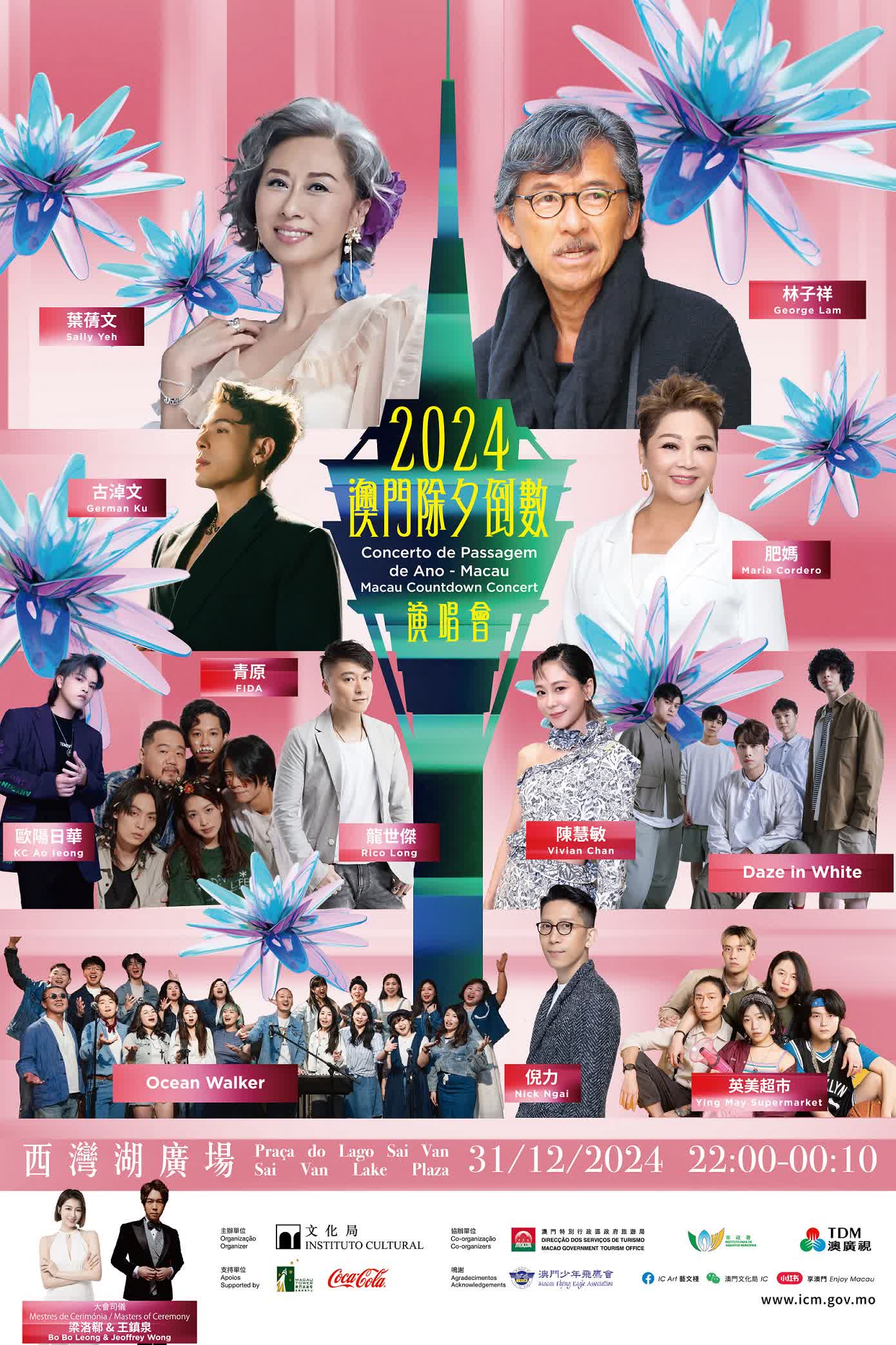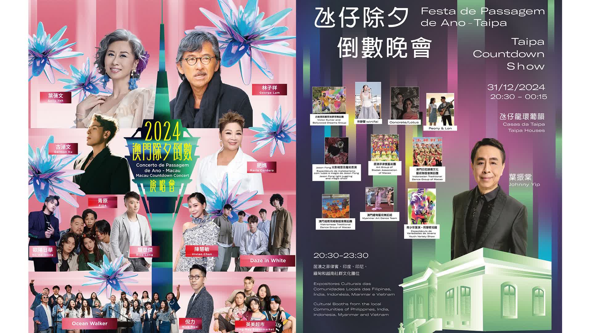由澳門特區政府文化局主辦,旅遊局、市政署及澳門廣播電視股份有限公司協辦的「2024澳門除夕倒數演唱會」和「2024氹仔除夕倒數晚會」將於12月31日晚上,分別在澳門西灣湖廣場和氹仔龍環葡韻舉行。