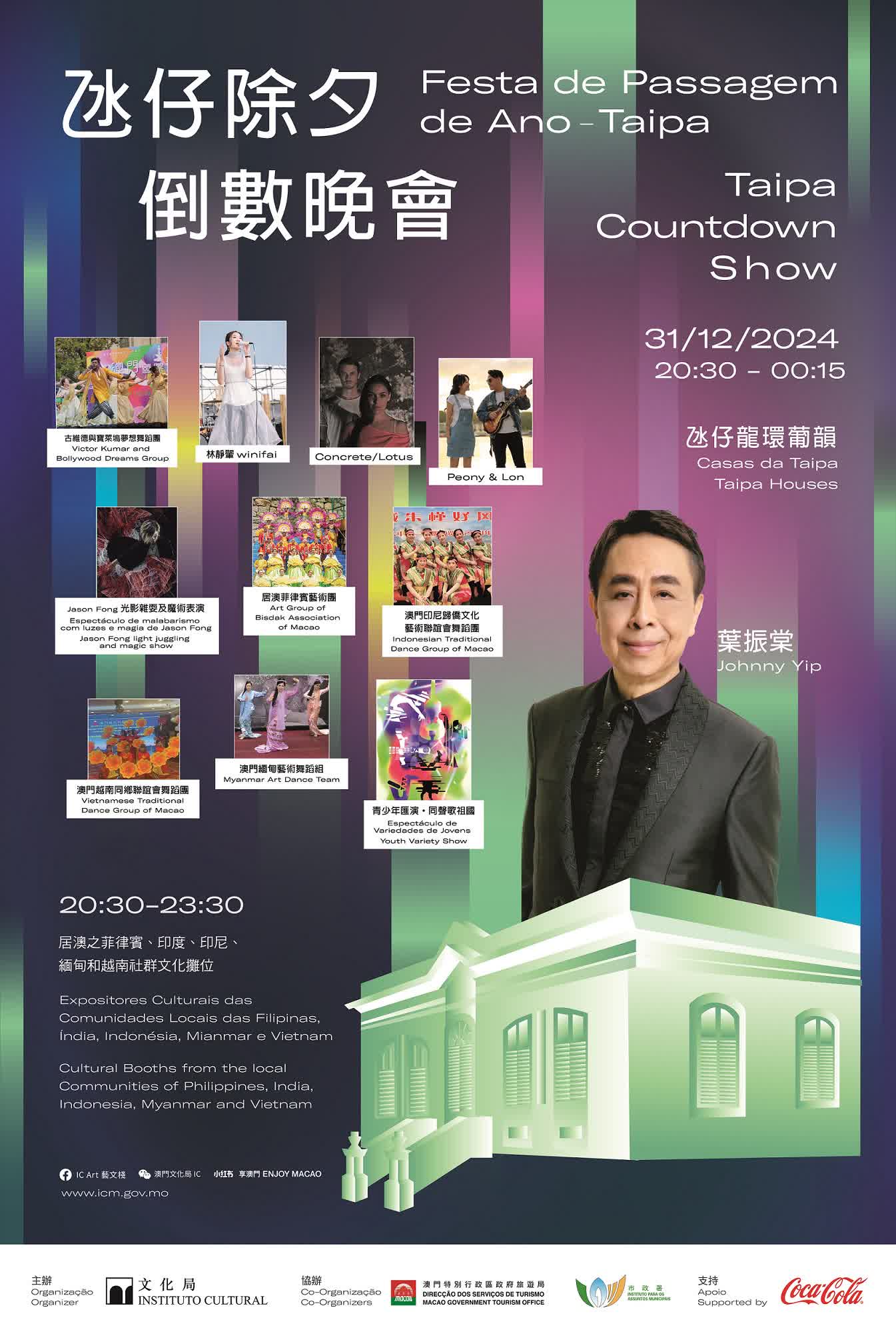 「2024氹仔除夕倒數晚會」將在龍環葡韻舉行,以多元文化共融為主軸,集合不同族群狂歡共慶,邀請香港歌手葉振棠作為壓軸演出嘉賓,送上多首膾炙人口的歌曲。舞台演出於晚上8 時30分開始,本地歌手及樂隊包括林靜翬、Concrete/Lotus、Peony & Lon將輪番獻唱帶動現場氣氛;此外,將為觀眾帶來一系列文化特色演出,包括Victor Kumar帶領的寶萊塢夢想舞蹈團、Associação Bisdak de Macau的菲律賓傳統歌舞、Jason Fong光影雜耍魔術表演、一眾本地青年上演的同聲歌祖國主題匯演,以及居澳之印尼、緬甸、越南藝團的傳統歌舞。除演出外,晚上8時30分至11時30分,現場設有居澳之菲律賓、印度、印尼、緬甸及越南社群文化攤位,展示當地傳統服飾、旅遊資訊、地道小食及飲品,彰顯多元文化、族群共融、和諧共處的都市生活氛圍。