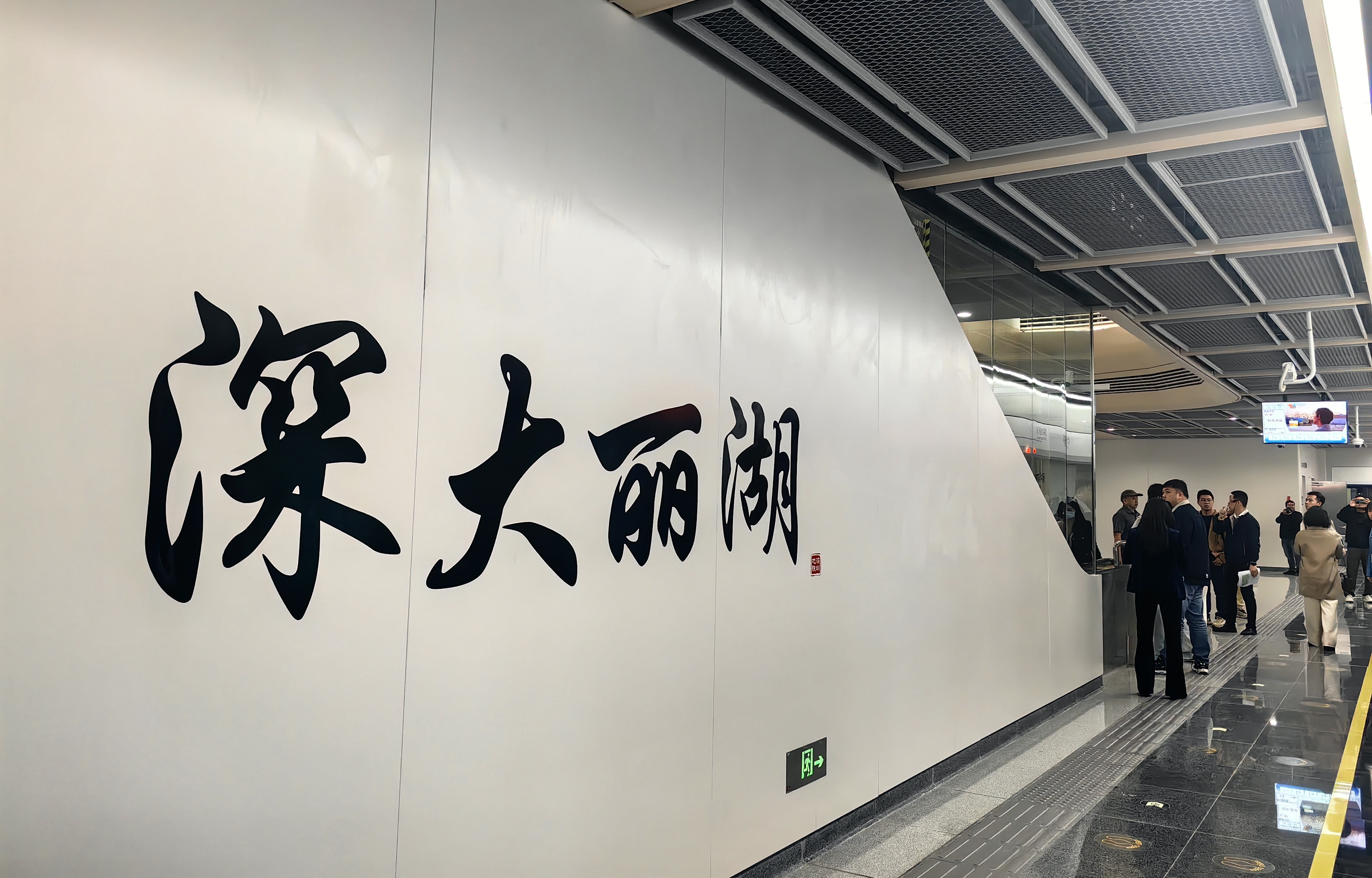 深大麗湖站則以「沙河綠廊」為設計靈感,源於周邊大沙河的生態環境。車站採用無柱-單柱的楔形結構,結合自然光影,打造地上與地下視覺相連的空間,流動的生命力與自然元素交織,為市民提供舒適且富有活力的出行體驗。