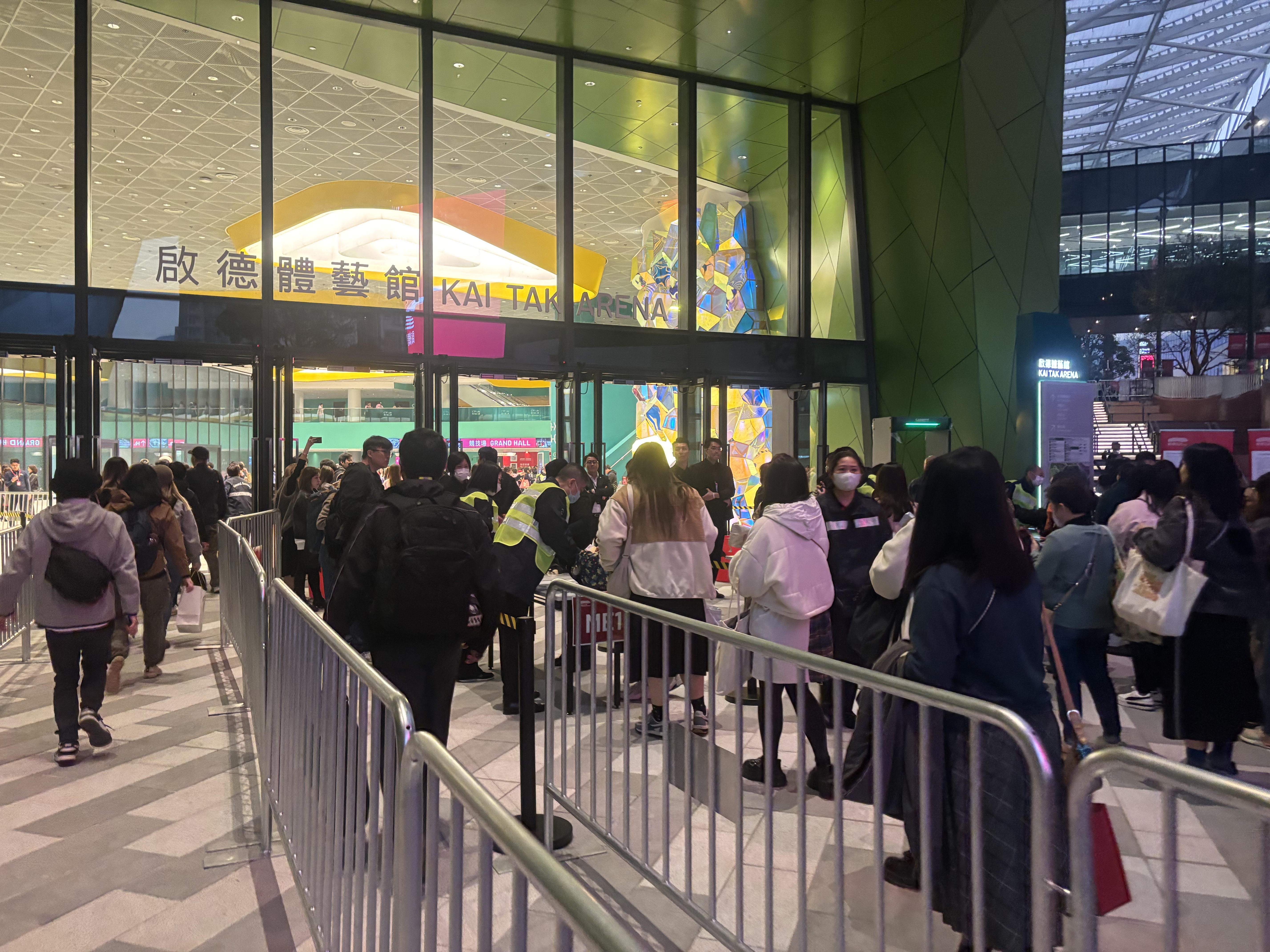 記者前往啟德體藝館,途中可見大量觀眾匯集場外。經一段路程行入場館後,可見館中設有試營業飲品小食店,價格適中但僅限現金付款。相鄰的啟德零售館亦有美食廣場、餐飲店舖針對表演延長營業時間,以接待更多來客。