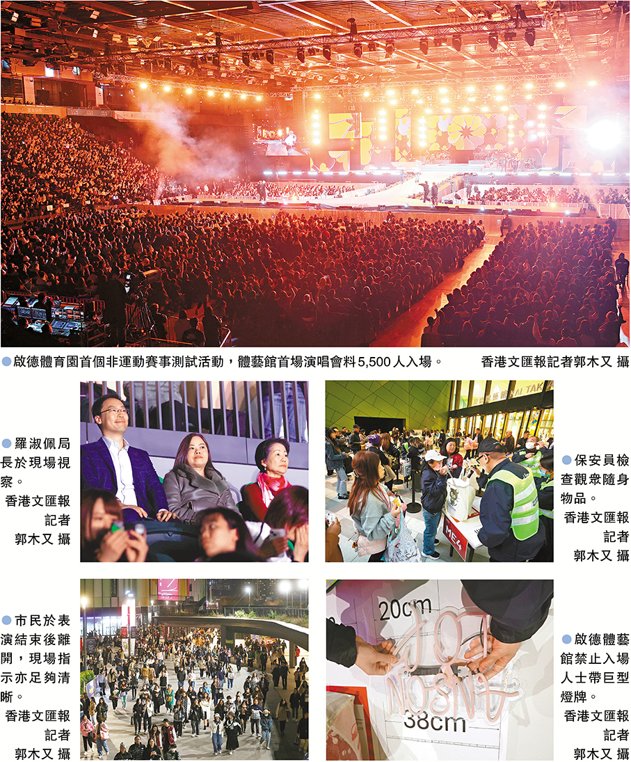 (香港文匯報記者 張弦、達里)香港啟德體育園體藝館昨晚上演啟用後首場演唱會《CHILL เก่ง Music Festival》,匯聚「MIRROR」在內等一眾香港與泰國歌星及團體表演,吸引大批粉絲到場支持,約5,500名觀眾到場,是體藝館首次以表演形式作壓力測試。多名市民均認為,經鐵路到場館非常方便,且比前往亞博館看演唱會方便得多。體育專員蔡健斌於散場後表示,整體上對各範疇及協作感到滿意,現場氣氛亦好,大部分觀眾亦很合作地沒有攜帶過大的支持燈牌,各類應援活動的時間及地點亦協調得很好。下月18日會有一個支持公益金的演唱會在主場館進行測試,預計屆時會有1.8萬名觀眾,警方會總結昨日的經驗調整演練細節,在人群管理和交通上做得更好。