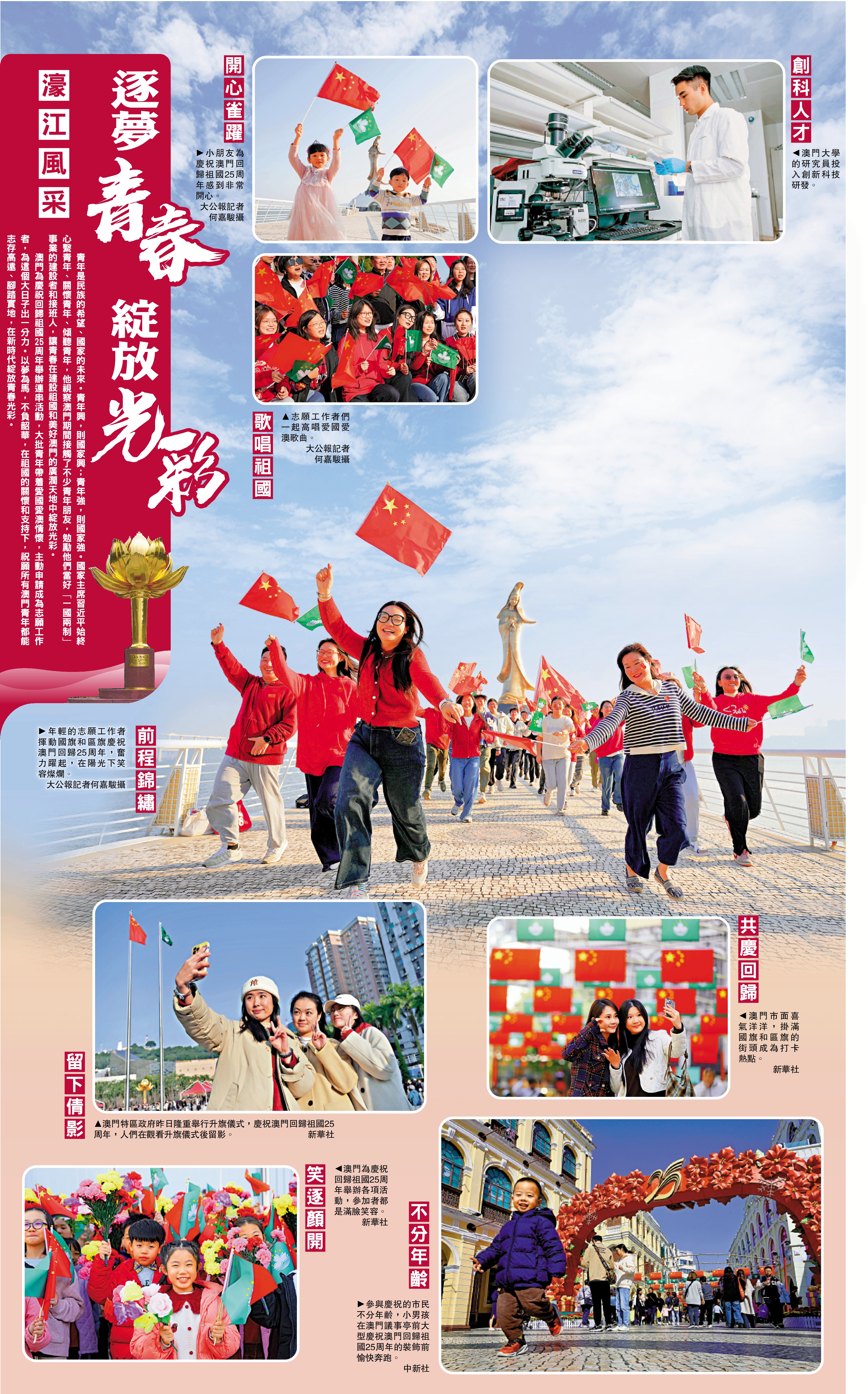 澳門為慶祝回歸祖國25周年舉辦連串活動,大批青年帶着愛國愛澳情懷,主動申請成為志願工作者,為這個大日子出一分力。以夢為馬,不負韶華,在祖國的關懷和支持下,祝願所有澳門青年都能志存高遠、腳踏實地,在新時代綻放青春光彩。