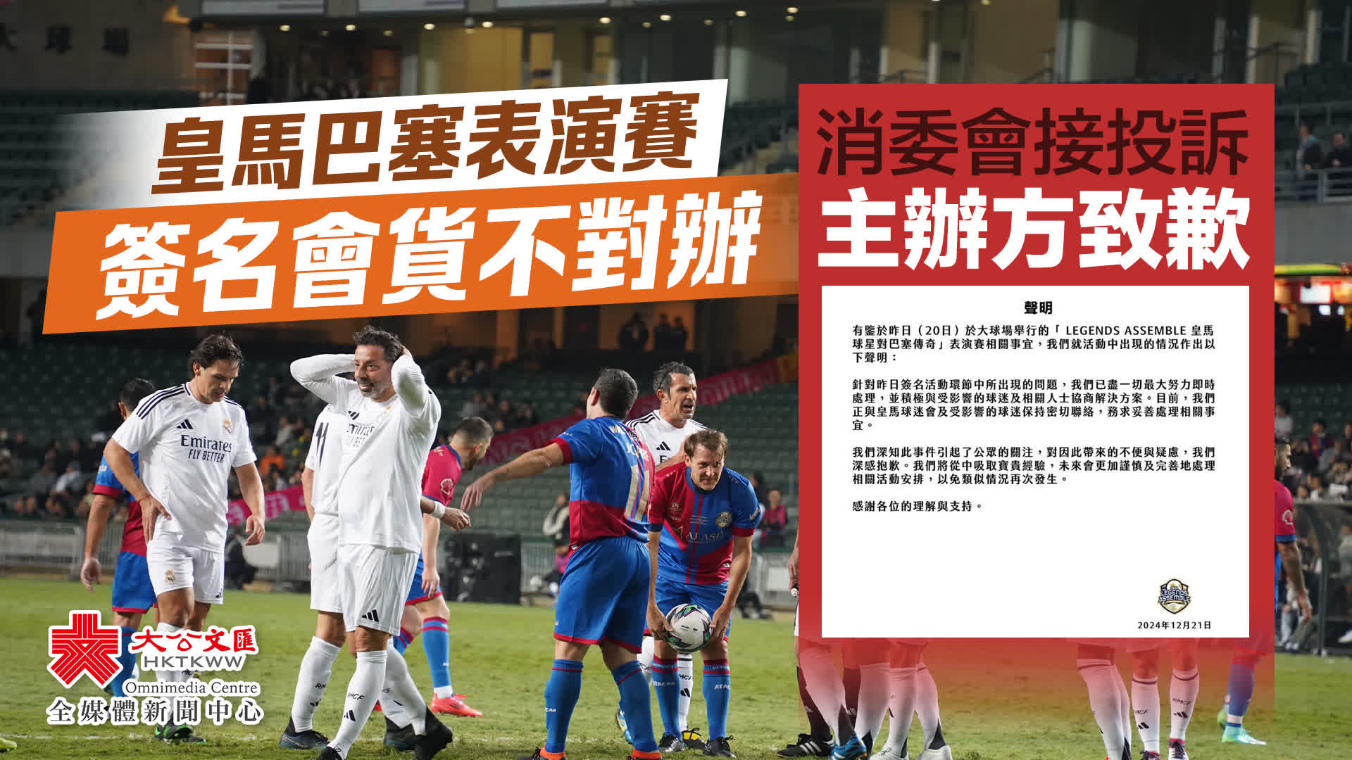 賽事主辦方Legend Assemble今日下午發聲明指,針對簽名活動出現的問題,已盡最大努力即時處理,正與皇馬香港球迷會及受影響球迷密切聯絡,務求妥善處理。主辦方又指,對事件帶來不便與疑慮深感抱歉,將汲取經驗,未來更謹慎及完善處理,以免再發生類似情況。