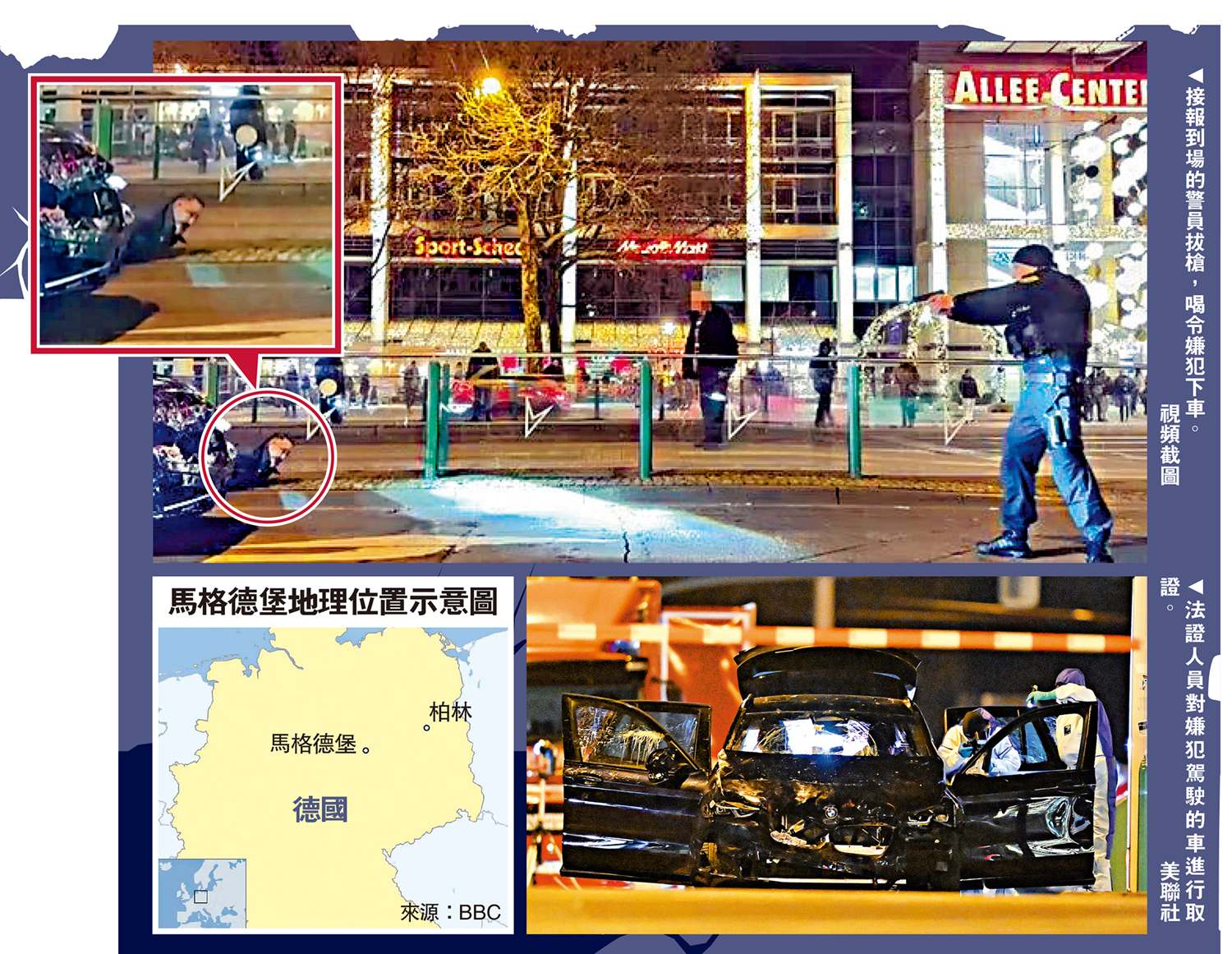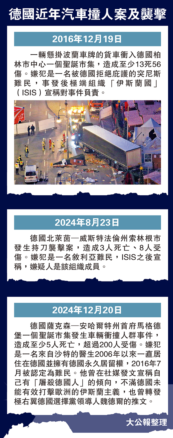 大公報綜合報道,德國薩克森─安哈爾特州首府馬格德堡一個聖誕市集,20日晚發生車輛衝撞人群事件。截至本港時間21日晚,事件已造成至少5人死亡、超過200人受傷。嫌犯當場被捕,是一名沙特難民。中國駐德國大使館表示,暫未收到中國公民傷亡的報告。分析指,德國明年2月將舉行大選,事件可能會激化德國國內反移民的社會情緒,或有利於極右翼德國選擇黨的大選選情。