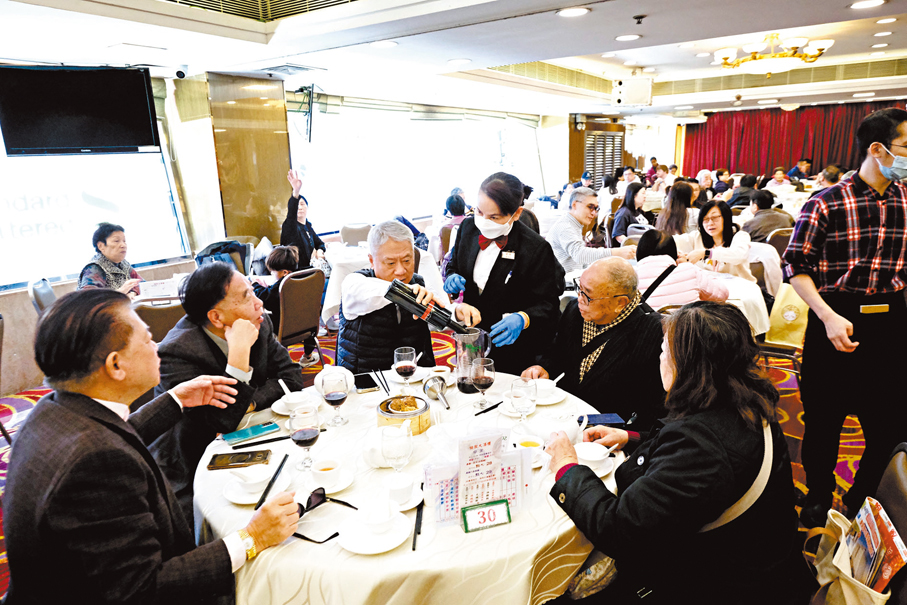 香港文匯報記者昨日下午到旺角的酒樓了解午巿情況,發現酒樓座無虛席,不少是一家大細和親友聚餐。倫敦大酒樓副總經理蘇萬誠表示,冬至正日訂枱已超過八成,剩餘一兩成會預留給未有訂枱的熟客,相信今年散客生意較多,預計晚上營業額將按年增加20%至25%,整體生意額暫恢復至疫情前的七八成,「散座而言,即家庭式一圍十人八人左右,今年生意非常好。早兩個星期,晚巿都是坐滿的。」