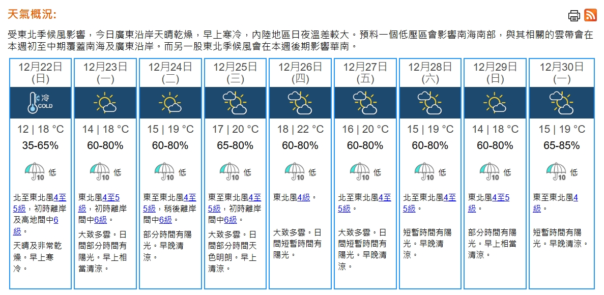 天文台預測,本港地區今日天氣天晴及非常乾燥,日間最高氣溫約18度。吹和緩至清勁北至東北風,初時離岸及高地間中吹強風。展望未來一兩日早晚仍然清涼。聖誕節假期雲量較多,日間和暖。