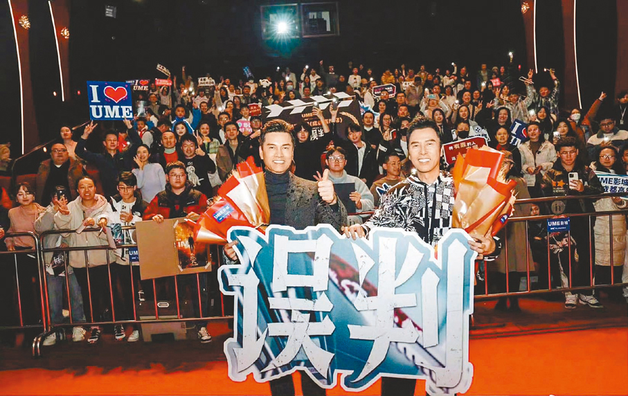 (香港文匯報 記者 阿祖)繼《破·地獄》在內地收穫破億元(人民幣,下同)的票房後,另一部由甄子丹自導自演的港片《誤判》雖然未正式在內地上映,但單是點映票房也已突破一億元,成績驕人,兩部電影的累積票房更是領跑內地同檔上映電影。《誤判》昨日在港舉行謝票活動,監製黃百鳴及演員許冠文 (米高)走遍3間戲院做8場謝票,談及今年多部港產片在內地有不俗的票房,黃百鳴及許冠文兩位資深香港電影人對港產片在內地影市「殺」出重圍感到鼓舞,同時讚揚香港電影業特有的優勢,寄望同業繼續創新,持續拍攝高質量電影。