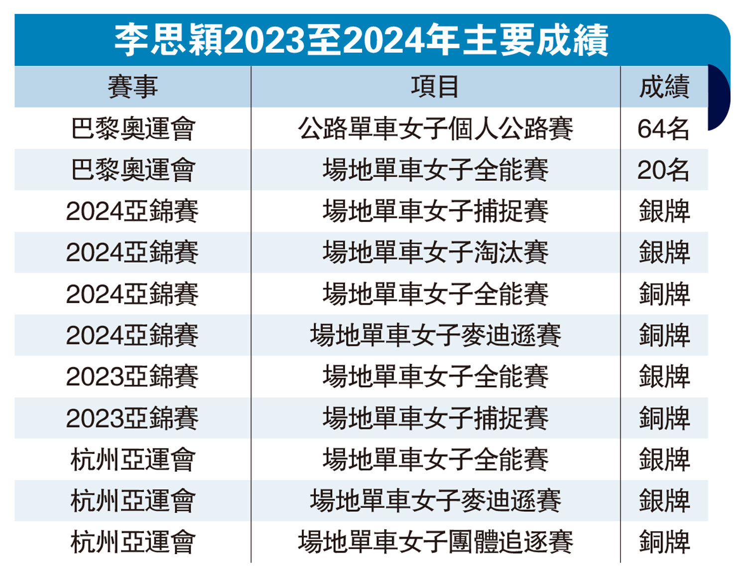 李思穎一直勤勤勉勉,努力通過參加更多賽事去鍛煉。她去年在杭州亞運會上獲得2銀1銅,在這兩年間的亞錦賽上亦斬獲3銀3銅的佳績,成長迅速。雖然在巴黎奧運會的公路賽和場地單車全能賽上的成績未如人意,但相信這次寶貴的參賽經驗,有助她在未來的比賽中有更好的發揮。