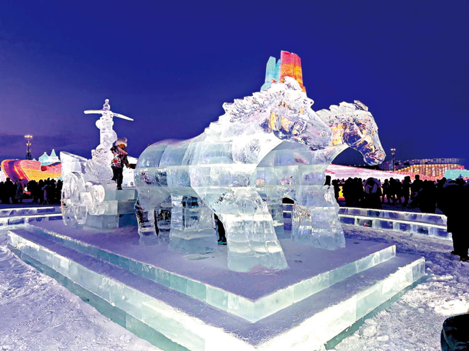 《王的戰車》是今年哈爾濱冰雪大世界推出的文旅演藝大作,依託哈爾濱冰雪大世界得天獨厚的冰雪之美,將山水實景演出的恢弘氣勢帶進劇場,利用超大型多媒體、全景式超級巨屏、世界級的舞台科技並結合電影級特效、震撼的原生態冰雪場景,讓觀眾在觀演時,恍若置身於沉浸式3A遊戲大作體驗的震撼場景之中。