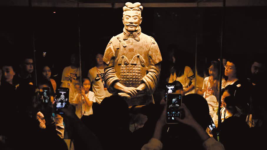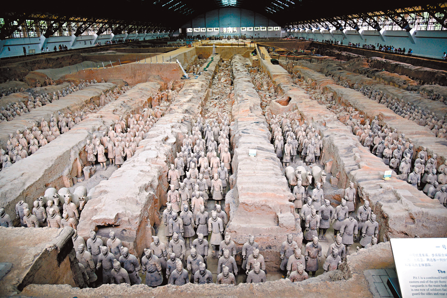 秦始皇帝陵位於陝西西安臨潼,史書記載,秦陵建設耗時38年之久,陵墓參建人數達70萬之巨,規模之宏達、埋藏之豐富世所罕見。1974年3月,當地村民在打井時意外發現破碎陶俑,讓秦兵馬俑「重見天日」。半個世紀來,考古工作者相繼發現了秦兵馬俑一、二、三號坑,總面積超過2萬平方米,發掘出土與真人真馬一般大小的陶俑、陶馬2,000多件,以及銅車馬、石甲冑、百戲俑等重要文物。