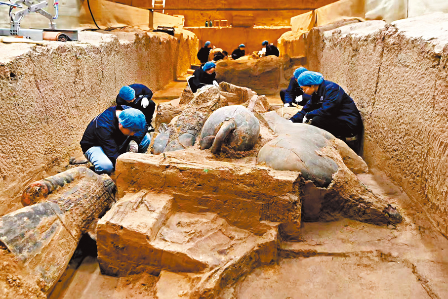 此外,此次發掘中,考古人員還在二號坑發現了兩處戰車遺蹟,初步清理出三匹陶馬和三尊陶俑。三尊陶俑中,兩尊為「車右」和「御手」俑,一尊推測為「車左」俑。專家表示,這次發掘對研究秦代的軍事組織和軍事制度,有重要意義。目前,工作人員正在秦兵馬俑二號坑實驗艙對這尊新發掘的高級軍吏俑進行深度清理和初步拼接。