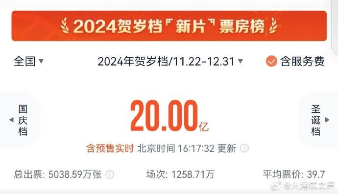 據央視新聞報道,截至12月22日16時17分,2024年賀歲檔(11月22日—12月31日)檔期電影票房(含預售)突破20億。