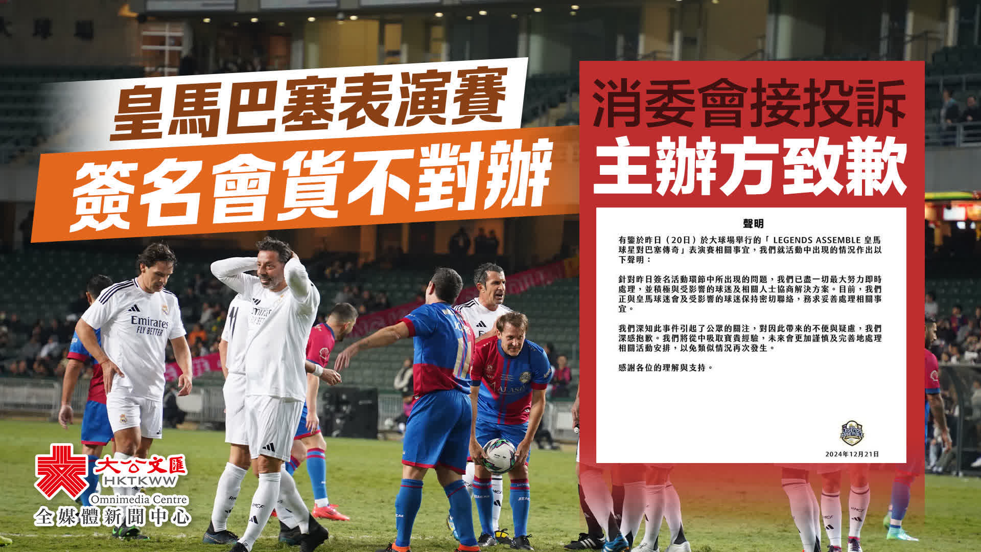 大公文匯全媒體報道,「LEGENDS ASSEMBLE 傳奇球星表演賽系列-皇馬球星對巴塞傳奇」20日在香港大球場舉行。部分球星懷疑不滿大會安排,在當日早上的簽名及見面會提早離場,部分買了6880元套票的球迷,未能同所有球員見面影相及索取簽名,批評貨不對辦。