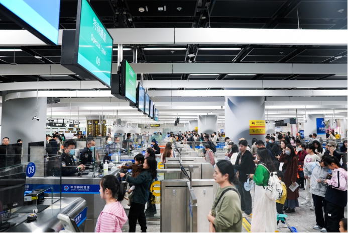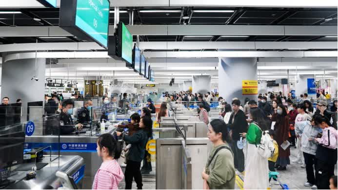 深圳邊檢總站西九龍邊檢站依託自主研發的「客流預測與疏導系統」科學部署勤務,提前掌握客流動態,備足執勤警力,在高峰期間打開全部人工查驗通道的基礎上,採取中外旅客分區查驗、快捷通道分類引導、通道類型分時切換等措施,靈活調整候檢區域,提高客流疏導效率,保障口岸通關平穩有序。