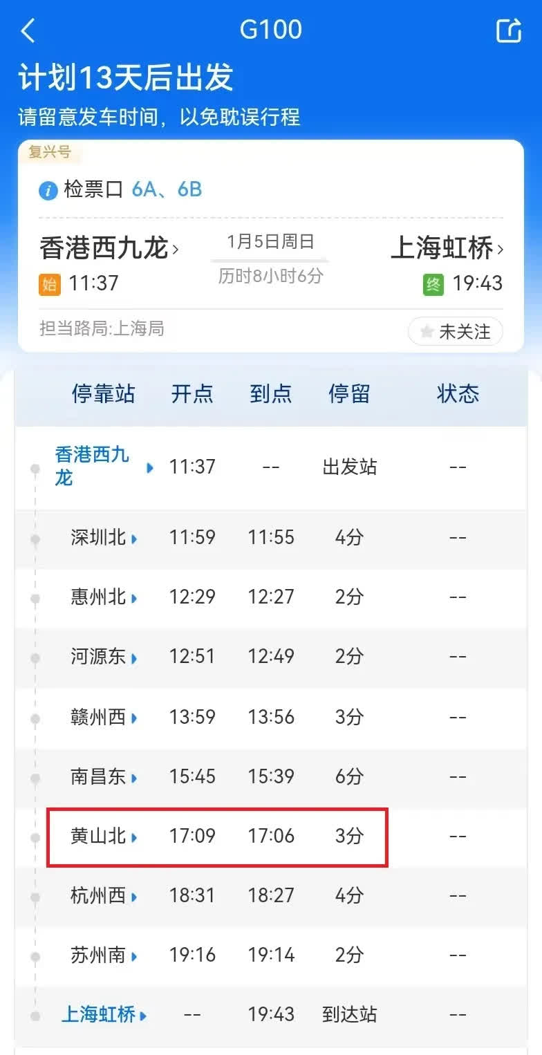 G99次高鐵:13:53從上海虹橋站始發途經蘇州南、杭州西,黃山北站出發時間為16:28於當天21:56到達香港西九龍站