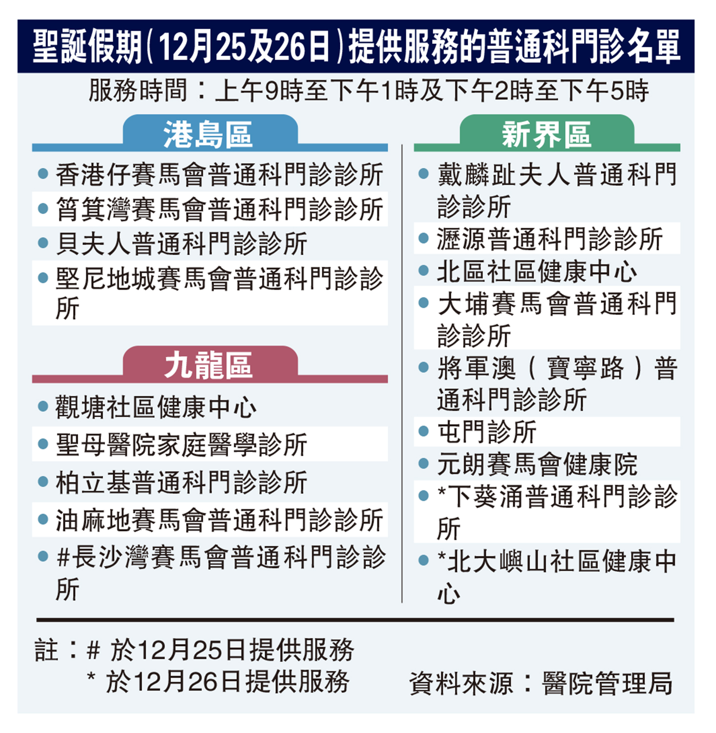 大公報報道,醫院管理局昨日公布,聖誕假期(12月25日及26日)期間將有18間普通科門診診所(詳見列表),提供公眾假期普通科門診服務,服務時間為上午9時至下午1時,以及下午2時至下午5時,求診人士可透過電話預約系統或「HA Go」流動應用程式內的「預約普通科門診」功能,預約診症時間。