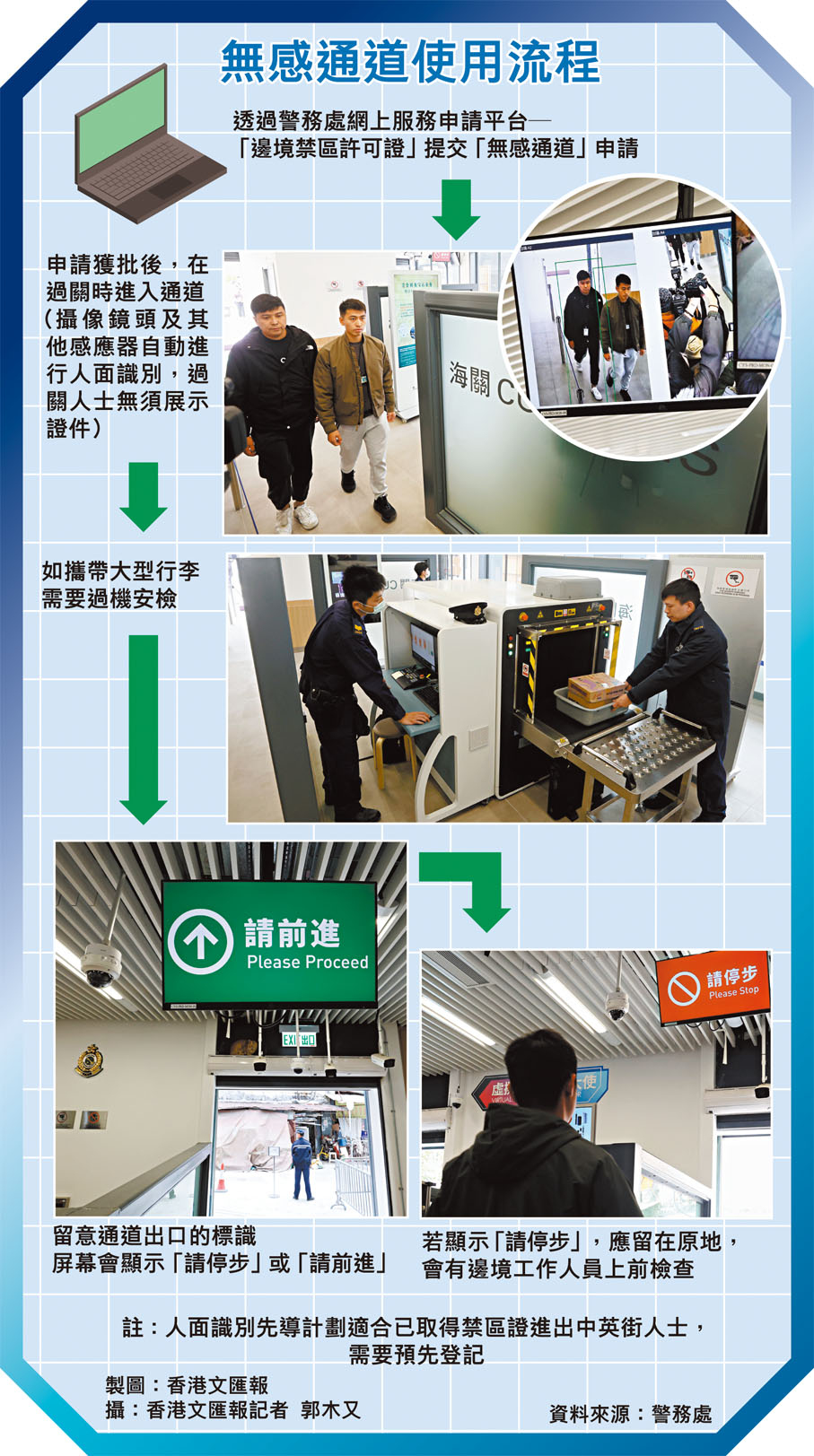 (香港文匯報記者 唐文)香港沙頭角中英街檢查站重置工程完成,昨日起檢查站推行全港首個人面辨識先導計劃,讓在中英街居住和工作的人士以「無感」方式進出中英街,其間無須停下步伐出示禁區許可證或進行指紋識別,目前已有逾4,300人登記。香港文匯報記者昨日直擊「無感通道」運作情況,通道兩端均有警員駐守,多個攝像鏡頭及感應設備從不同角度拍攝通關人士,伴隨屏幕顯示實時圖像,若通過面容比對,出口位置會有「請前進」指示。中英街檢查站是試點,其他口岸日後亦可能引入人面辨識、「刷面」過關。