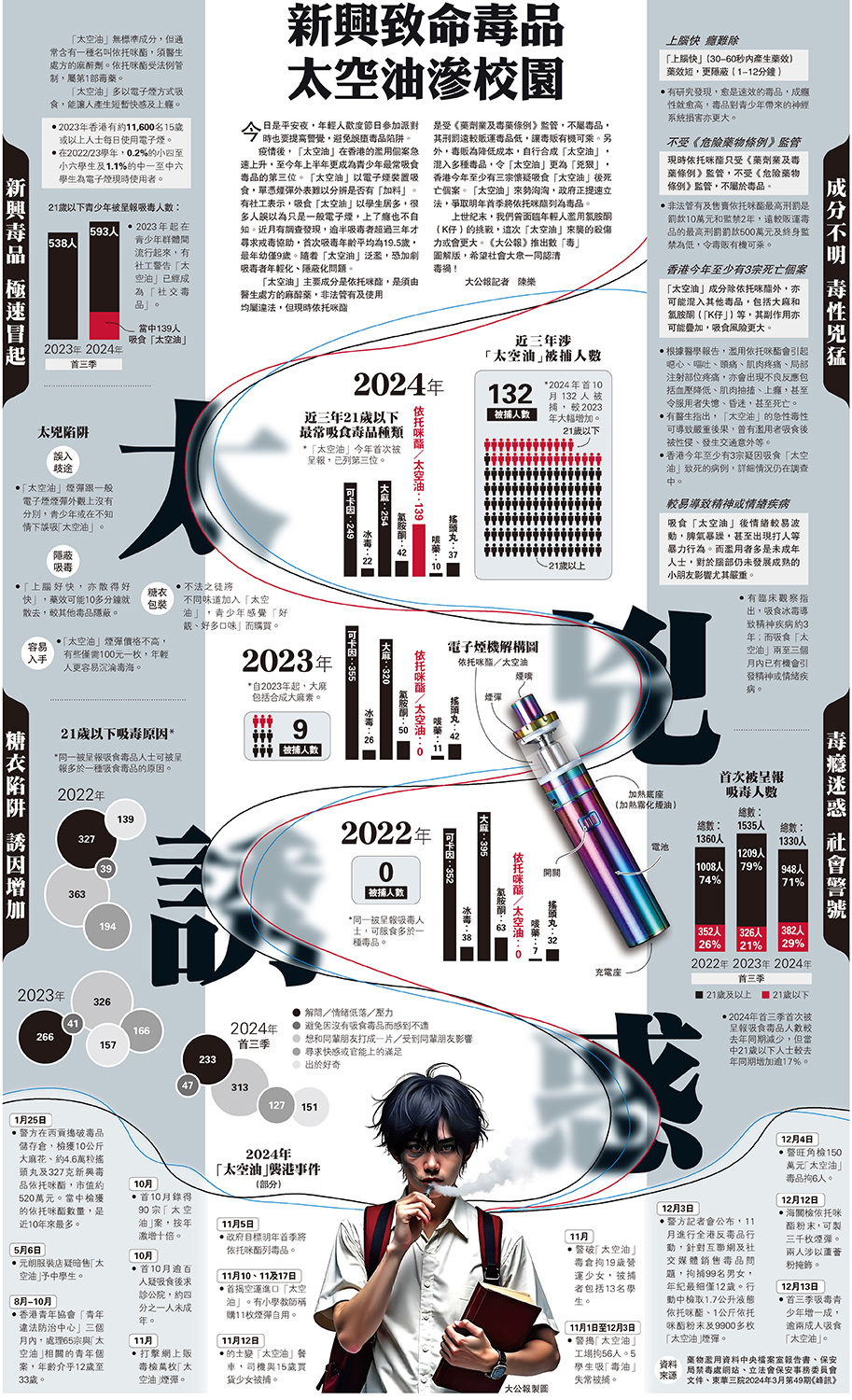 上世紀末,我們曾面臨年輕人濫用氯胺酮(K仔)的挑戰,這次「太空油」來襲的殺傷力或會更大。《大公報》推出數「毒」圖解版,希望社會大眾一同認清毒禍!