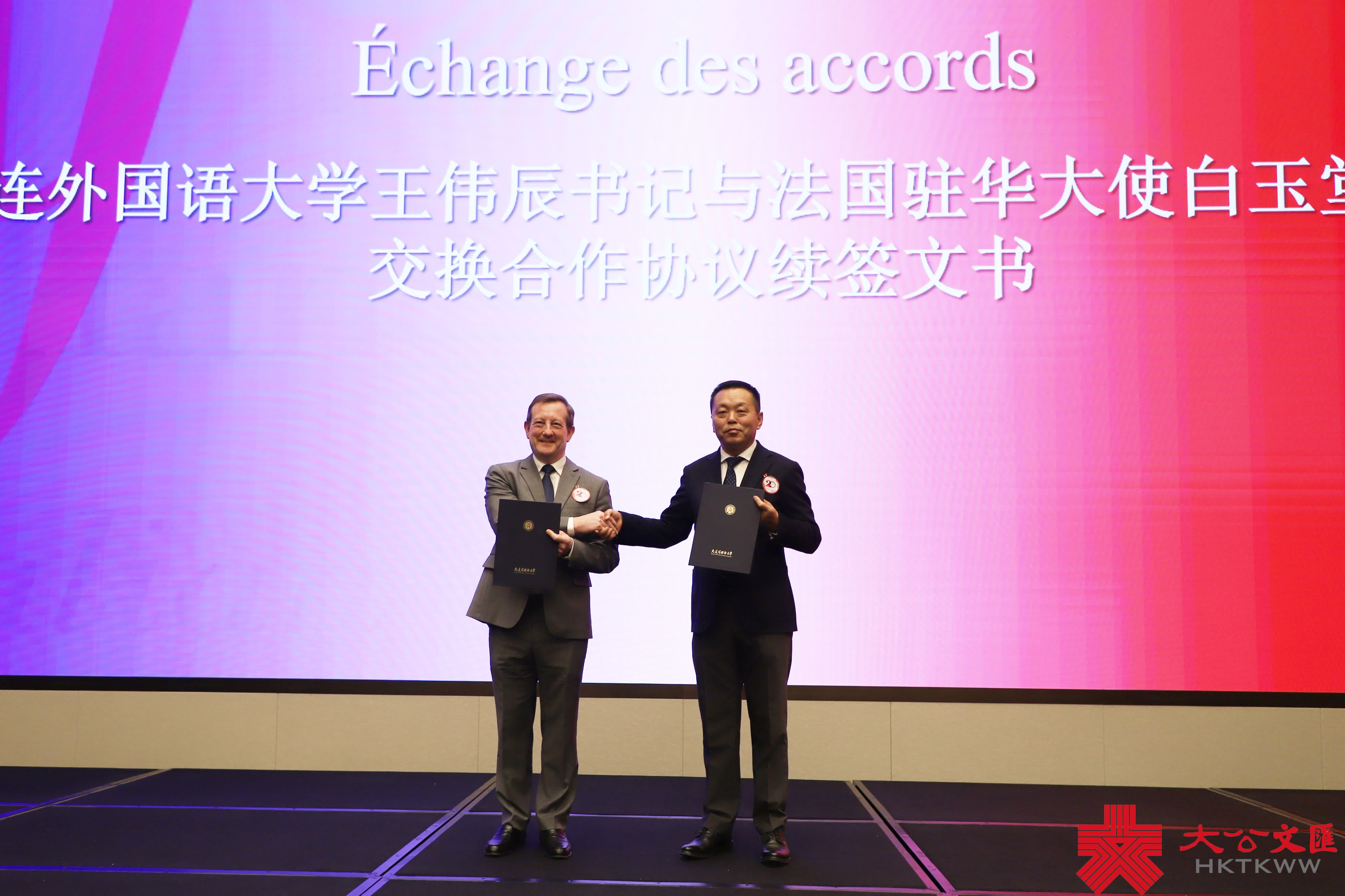 (大公文匯網記者宋偉大連報道)作為中國東北地區唯一的法語聯盟,大連法語聯盟23日晚舉行20周年慶典活動。法國駐華大使白玉堂與大連外國語大學黨委書記王偉辰交換合作協議續簽文書。白玉堂表示,2024年是中法建交60周年,同時也是大連法語聯盟成立20周年。大連法語聯盟促進法語和漢語人士之間的緊密交流,為法語及法國文化推廣發揮了重要作用,同時也彰顯了法中兩國深厚和堅實的文化與外交關係。