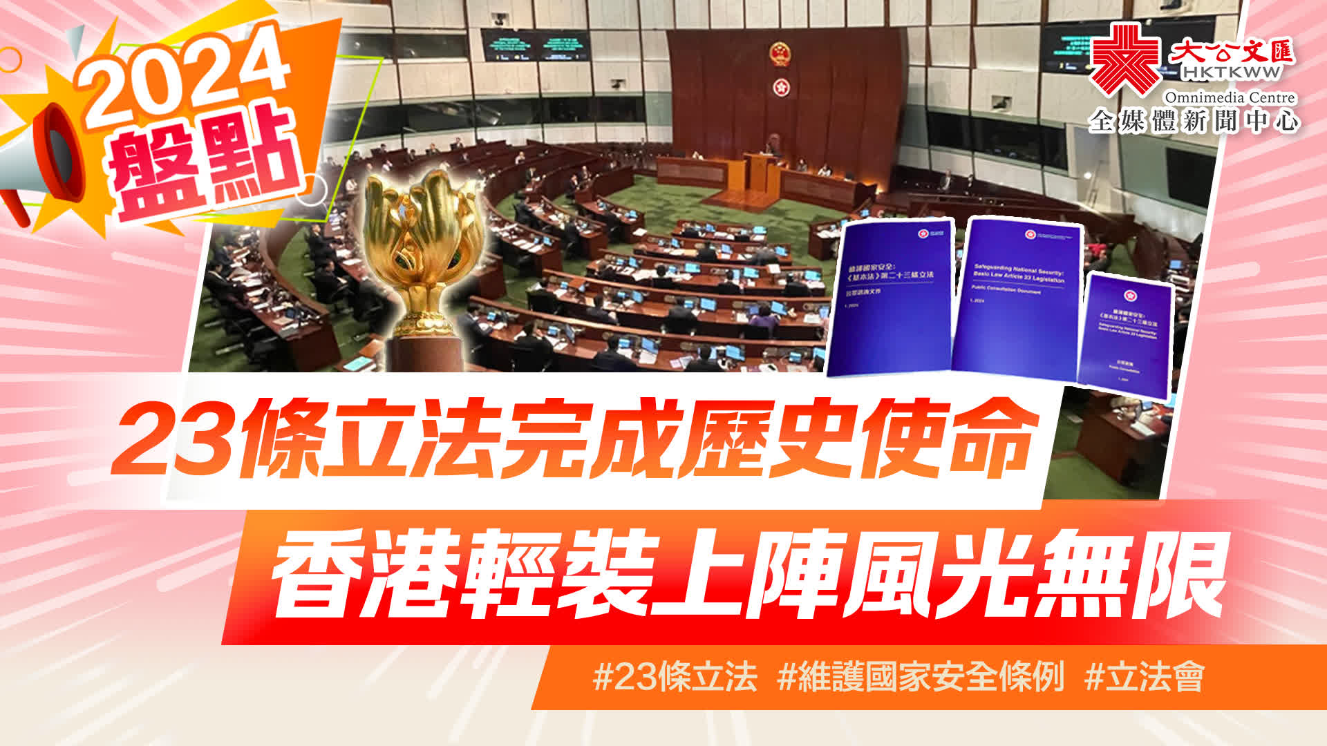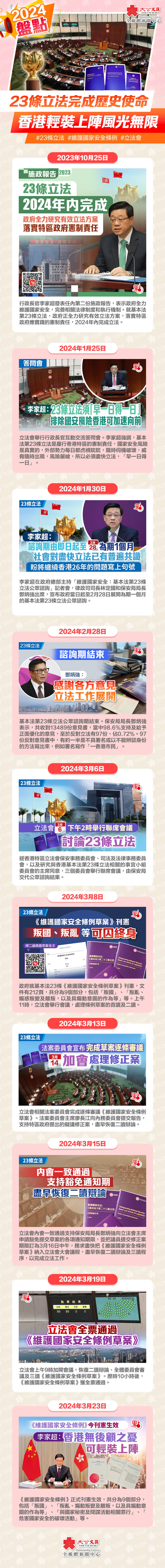 大公文匯全媒體報道,2024年3月23日,是香港等待了26年8個月零19日的歷史時刻,是特區第六屆政府和第七屆立法會終於共同完成光榮使命的歷史時刻,是香港特區共同譜寫光榮歷史的驕傲時刻。基本法第23條立法的憲制責任和歷史使命終於完成,《維護國家安全條例》三讀通過並刊憲公布實施,國家安全得到有效保障。香港可以無後顧之憂,輕裝上陣,全力聚焦發展經濟、改善民生,風光無限好!