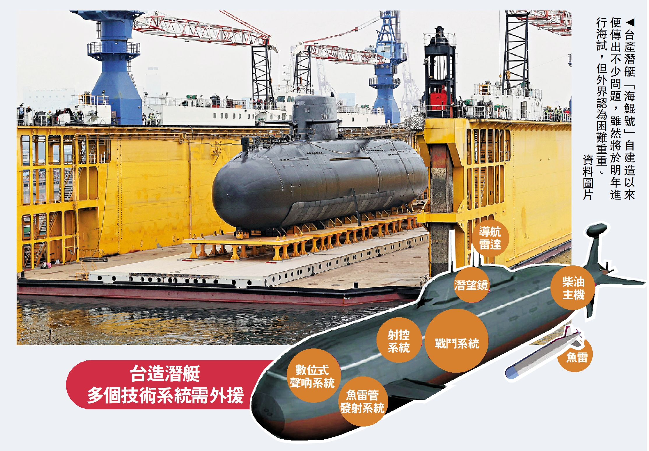 大公報援引中通社報道:台當局自造的首艘潛艇「海鯤號」不但海上測試大幅延期,且台海軍退役司令、中國國民黨「立委」陳永康近日透露,「海鯤號」的海試存相當多風險,出海測試人員若未受專業訓練,「恐怕連廁所都不會上」。據說「海鯤號」仍有超過70個項目未通過檢測,要完全過關後才能出海進行海試。國民黨方面認為在「海鯤號」未通過測試前不應再編列巨額預算製造後續的潛艇,並質疑潛艇不符合台方的作戰需要。