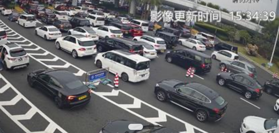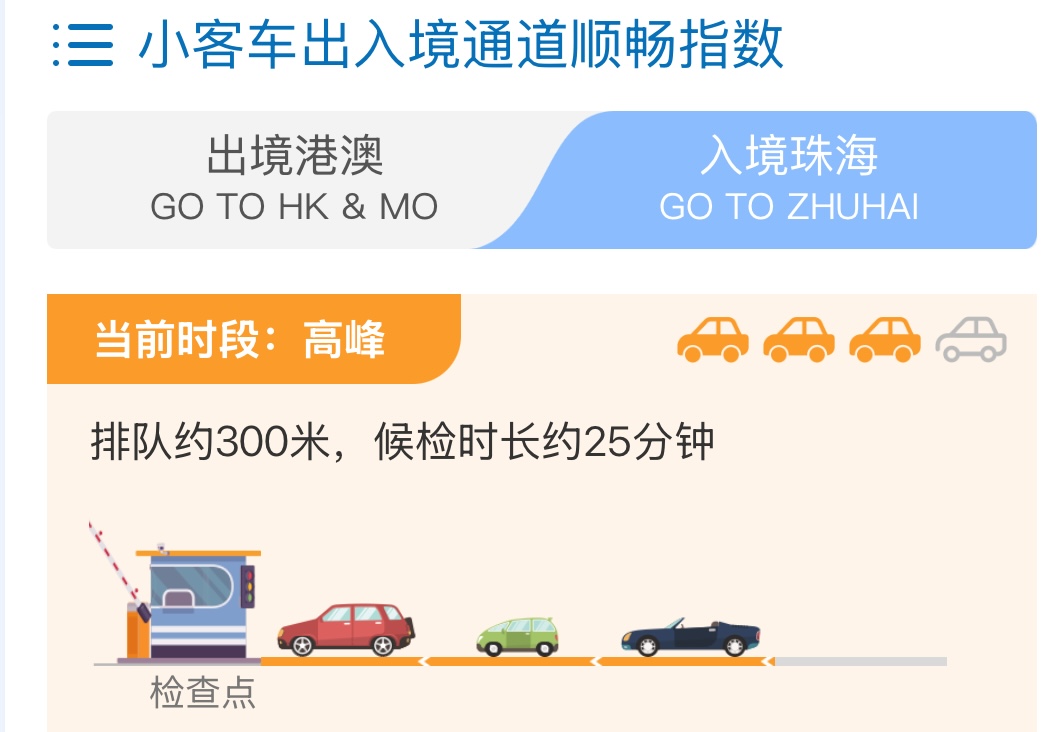 據「港珠澳大橋」早前預料,今日上午11時至下午3時是入境珠海車流高峰。至3時30分左右,入境珠海車流稍有好轉,但依舊處於「繁忙」狀態,車流約300米,候檢時長需要25分鐘左右。