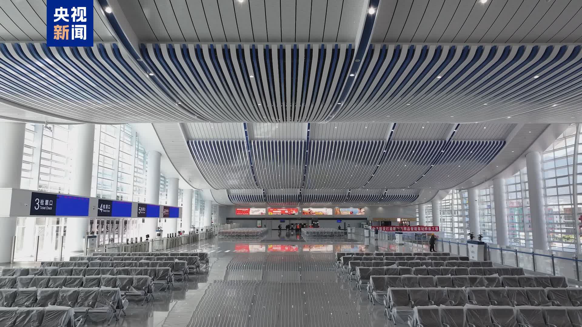 在車站裏,新建站房裝飾裝修已完成,融入當地自然風光和民族文化元素的車站候車大廳裝扮一新,施工人員正有序開展客運服務設備的調試工作。