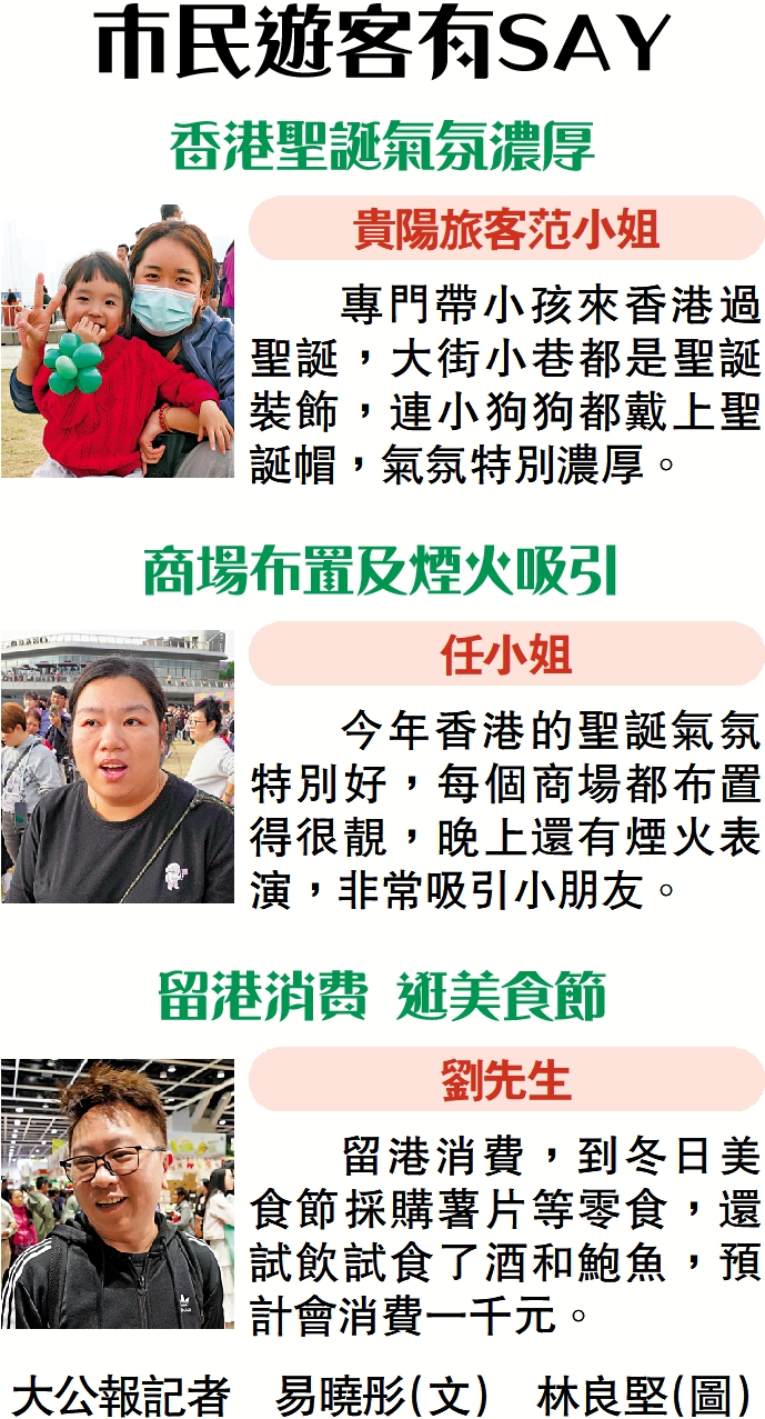 市民任小姐選擇留港消費,她說,感覺今年香港的聖誕氣氛特別熱鬧,街上的遊人較往年多,各處的裝飾很漂亮,商場內有很多吸引小朋友的聖誕布置,她希望去每個商場打卡。她表示,「難得一年一次聖誕節,晚上亦會帶小朋友們食大餐,買聖誕禮物,預計消費近5000元。」