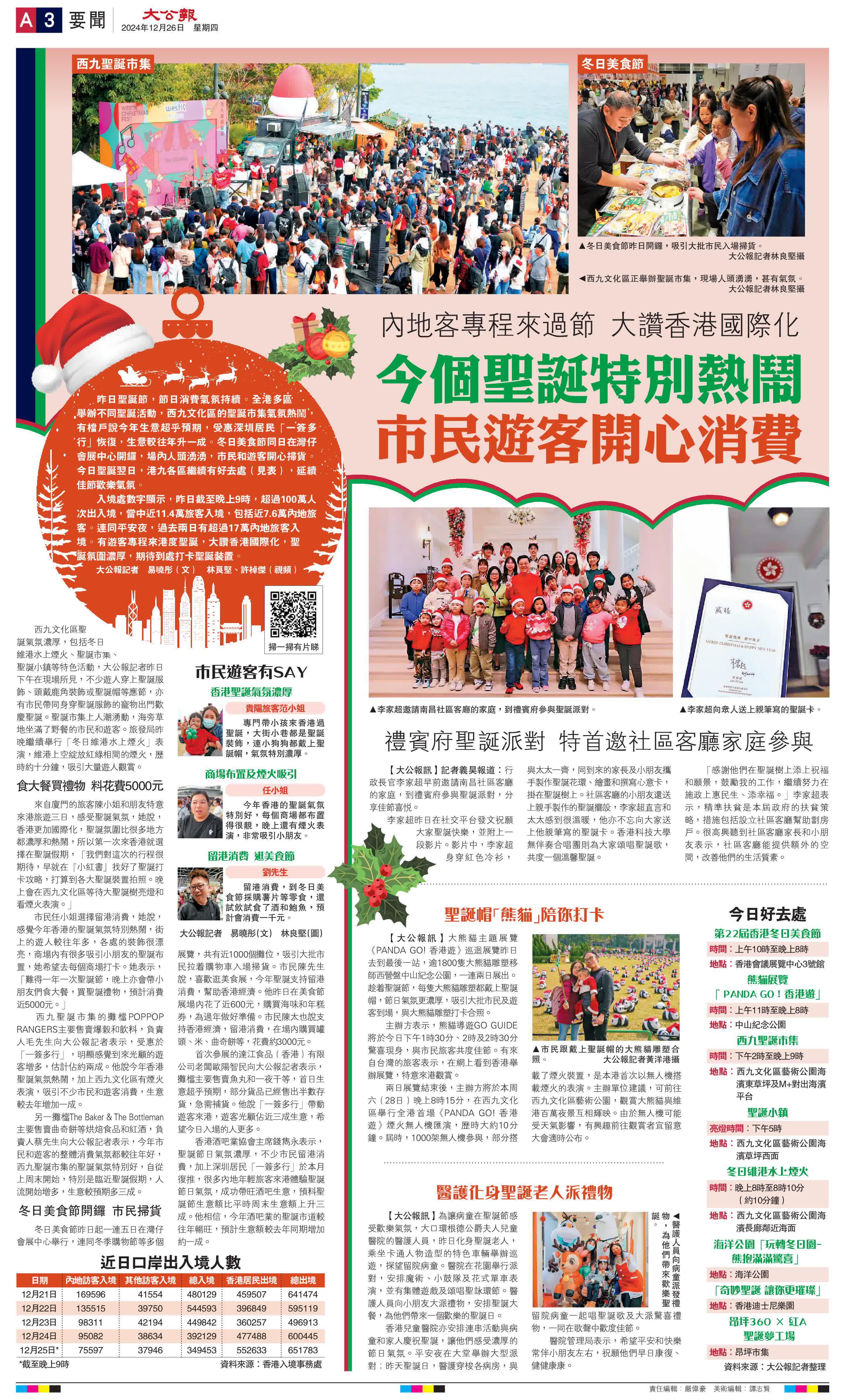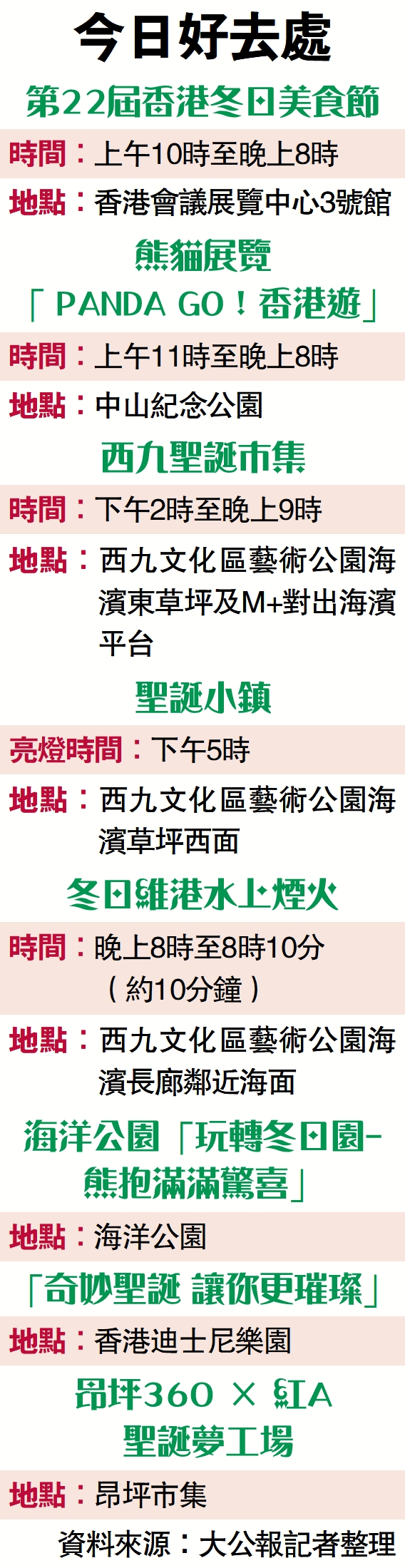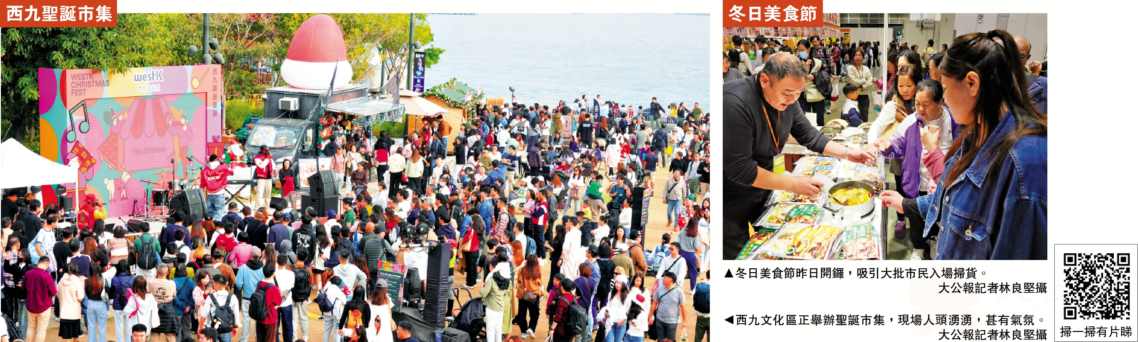 (大公報記者 易曉彤)昨日聖誕節,節日消費氣氛持續。全港多區舉辦不同聖誕活動,西九文化區的聖誕市集氣氛熱鬧,有檔戶說今年生意超乎預期,受惠深圳居民「一簽多行」恢復,生意較往年升一成。冬日美食節同日在灣仔會展中心開鑼,場內人頭湧湧,市民和遊客開心掃貨。今日聖誕翌日,港九各區繼續有好去處(見表),延續佳節歡樂氣氛。