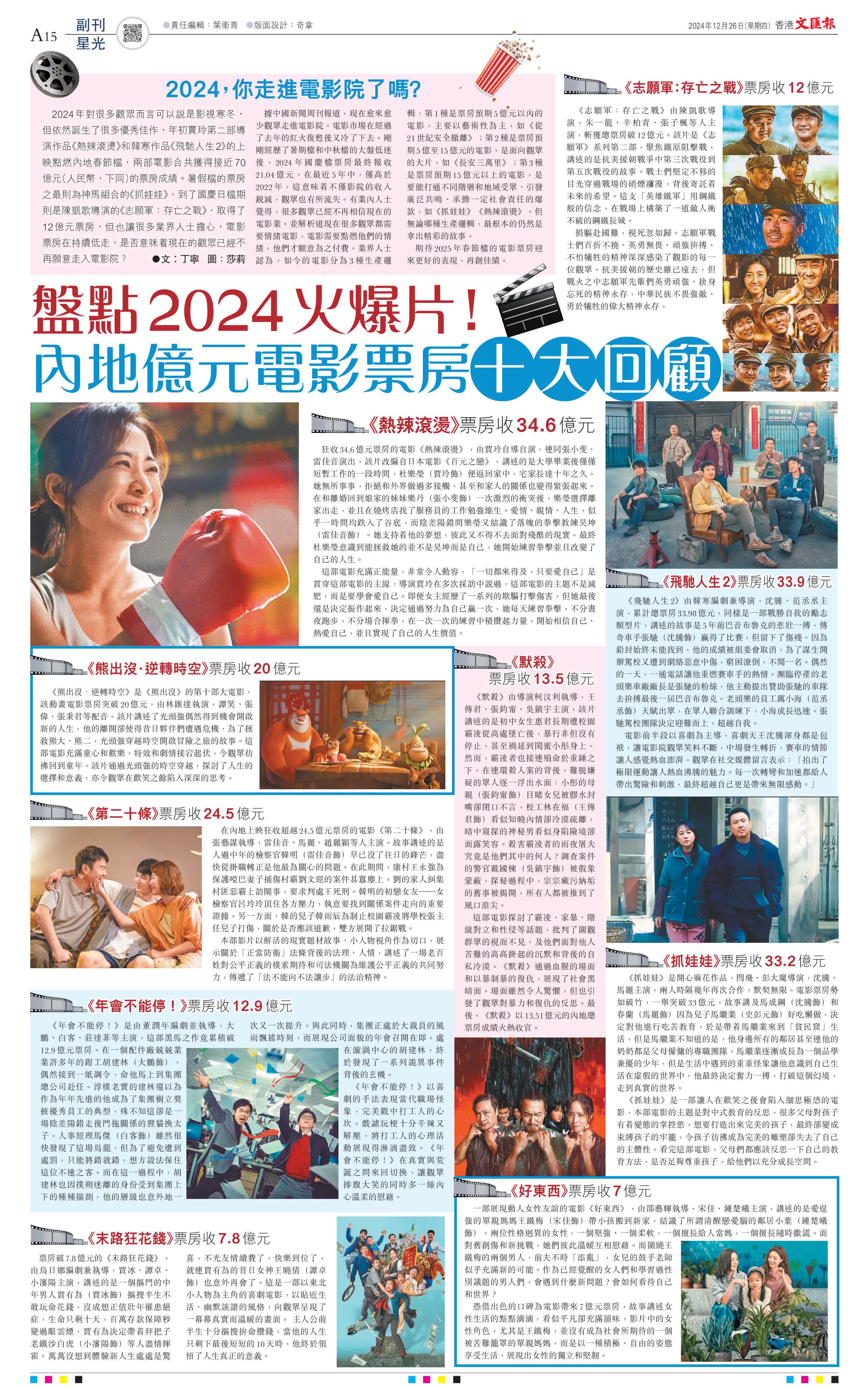 (文:丁寧 圖:莎莉)2024年對很多觀眾而言可以說是影視寒冬,但依然誕生了很多優秀佳作,年初賈玲第二部導演作品《熱辣滾燙》和韓寒作品《飛馳人生2》的上映點燃內地春節檔,兩部電影合共獲得接近70億元(人民幣,下同)的票房成績。暑假檔的票房之最則為神馬組合的《抓娃娃》,到了國慶日檔期則是陳凱歌導演的《志願軍:存亡之戰》,取得了12億元票房,但也讓很多業界人士擔心,電影票房在持續低走,是否意味着現在的觀眾已經不再願意走入電影院?