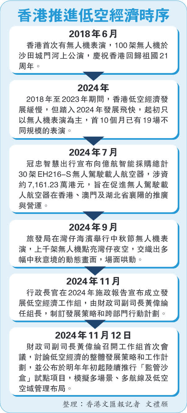 香港特區亦不遑多讓,首10個月先後有近20場無人機表演。最新一份施政報告宣布成立發展低空經濟工作組,制訂發展策略和跨部門行動計劃,明年初起陸續推行「監管沙盒」試點項目,模擬多場景、多航線及低空空域管理布局。
