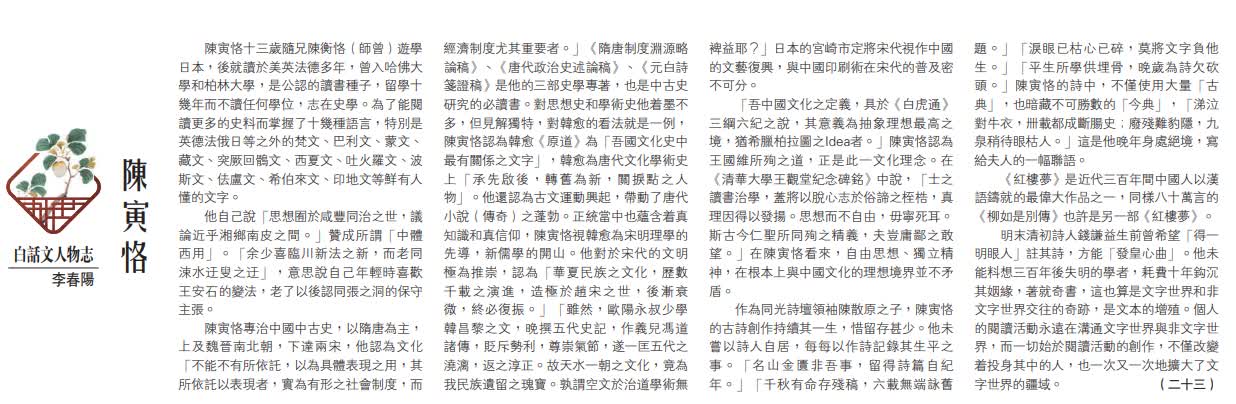 陳寅恪十三歲隨兄陳衡恪(師曾)遊學日本,後就讀於美英法德多年,曾入哈佛大學和柏林大學,是公認的讀書種子,留學十幾年而不讀任何學位,志在史學。為了能閱讀更多的史料而掌握了十幾種語言,特別是英德法俄日等之外的梵文、巴利文、蒙文、藏文、突厥回鶻文、西夏文、吐火羅文、波斯文、佉盧文、希伯來文、印地文等鮮有人懂的文字。